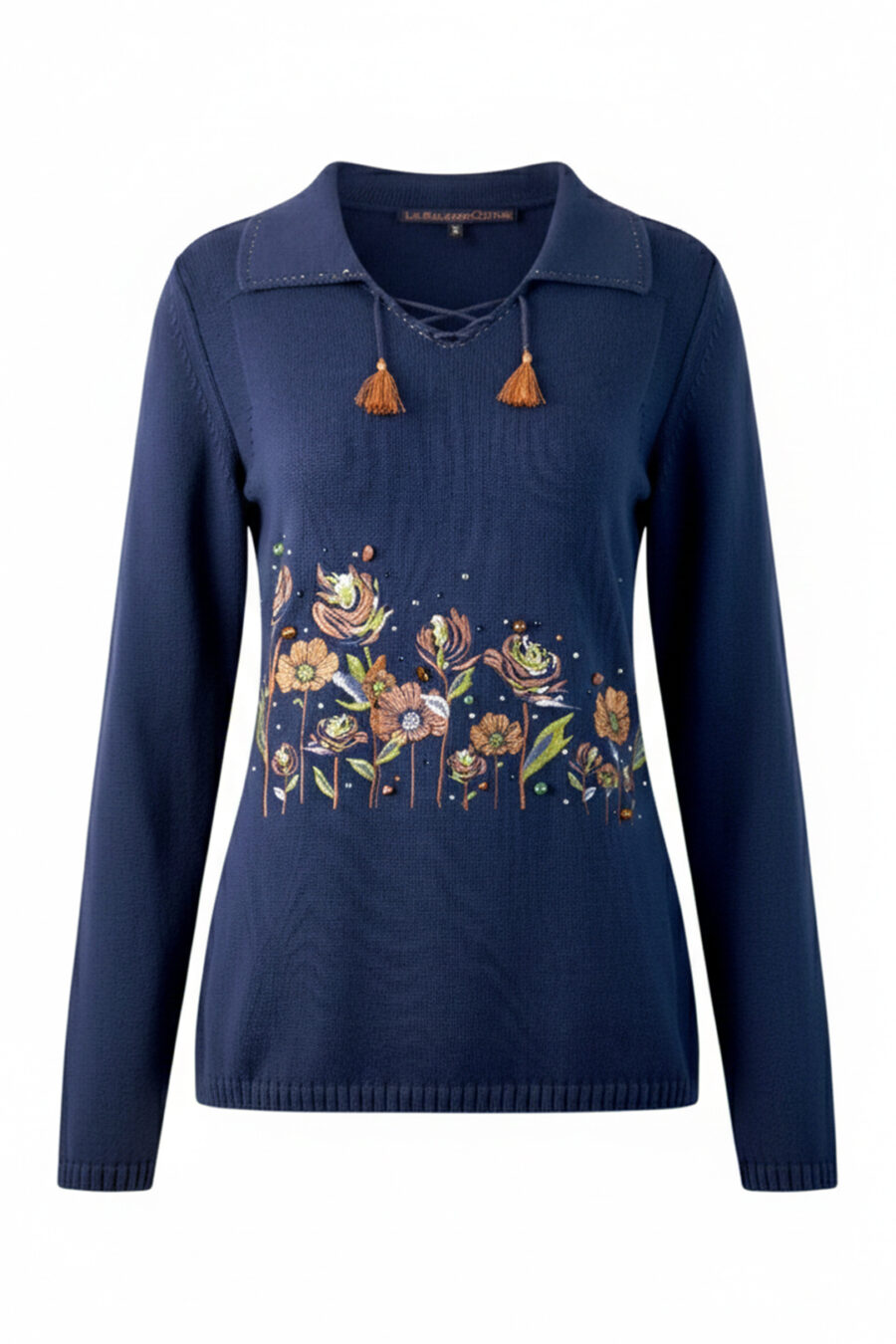 Langarm-Pullover mit “Autumn Meadow-embroidery”, handappliziert mit 50 Natursteinen und Kristallen, aus 100% Baumwolle und mit 72.000 Stichen bestickt