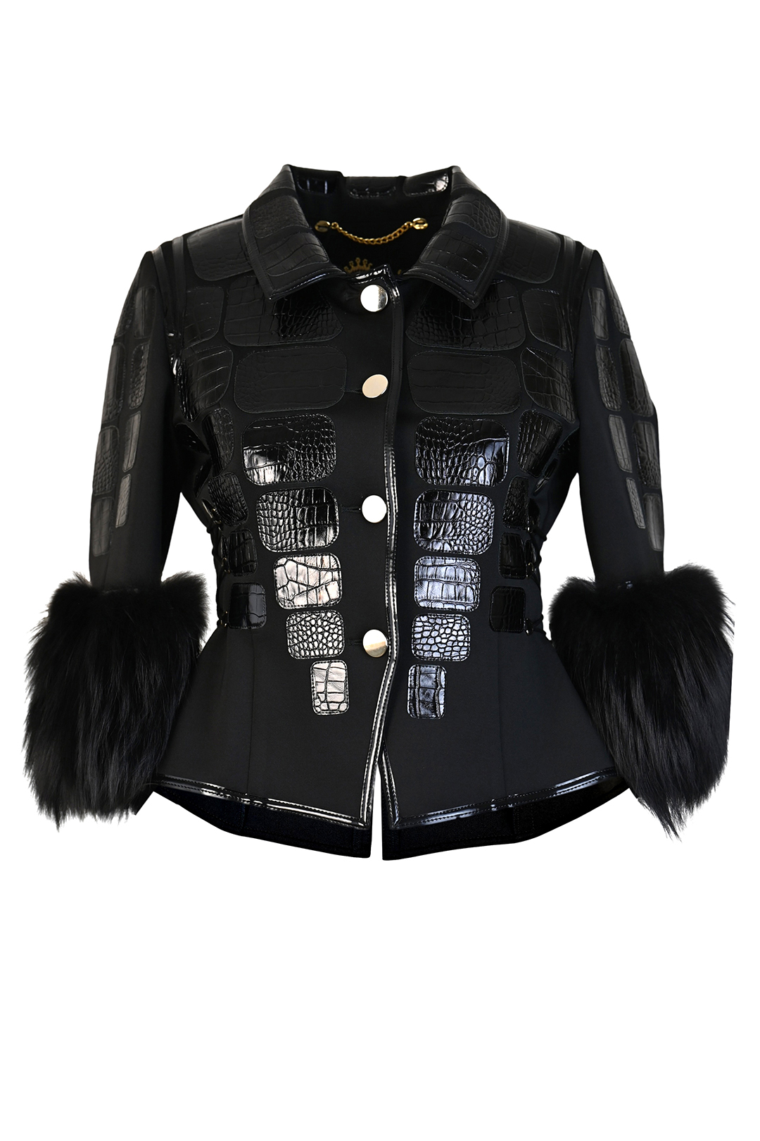 Jacke mit Corsage-Patches in Kroko-Optik, Goldbeschlägen auf Mesh appliziert, Kurzarm