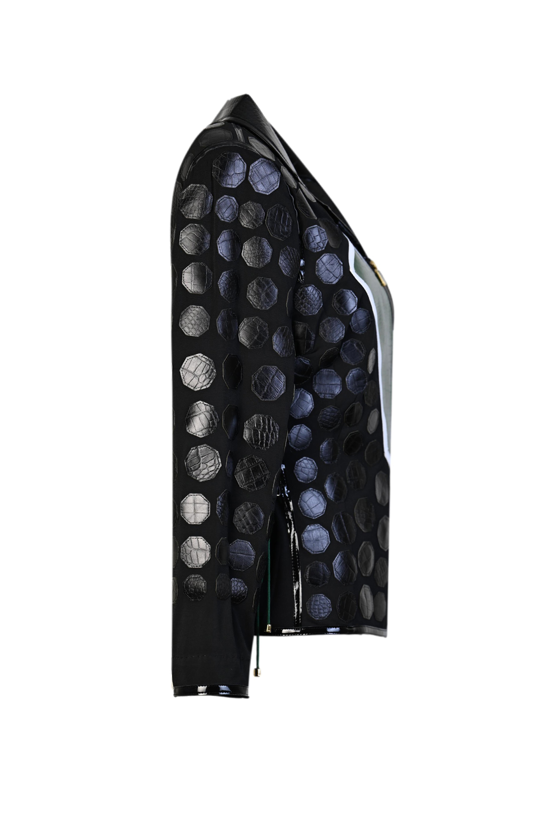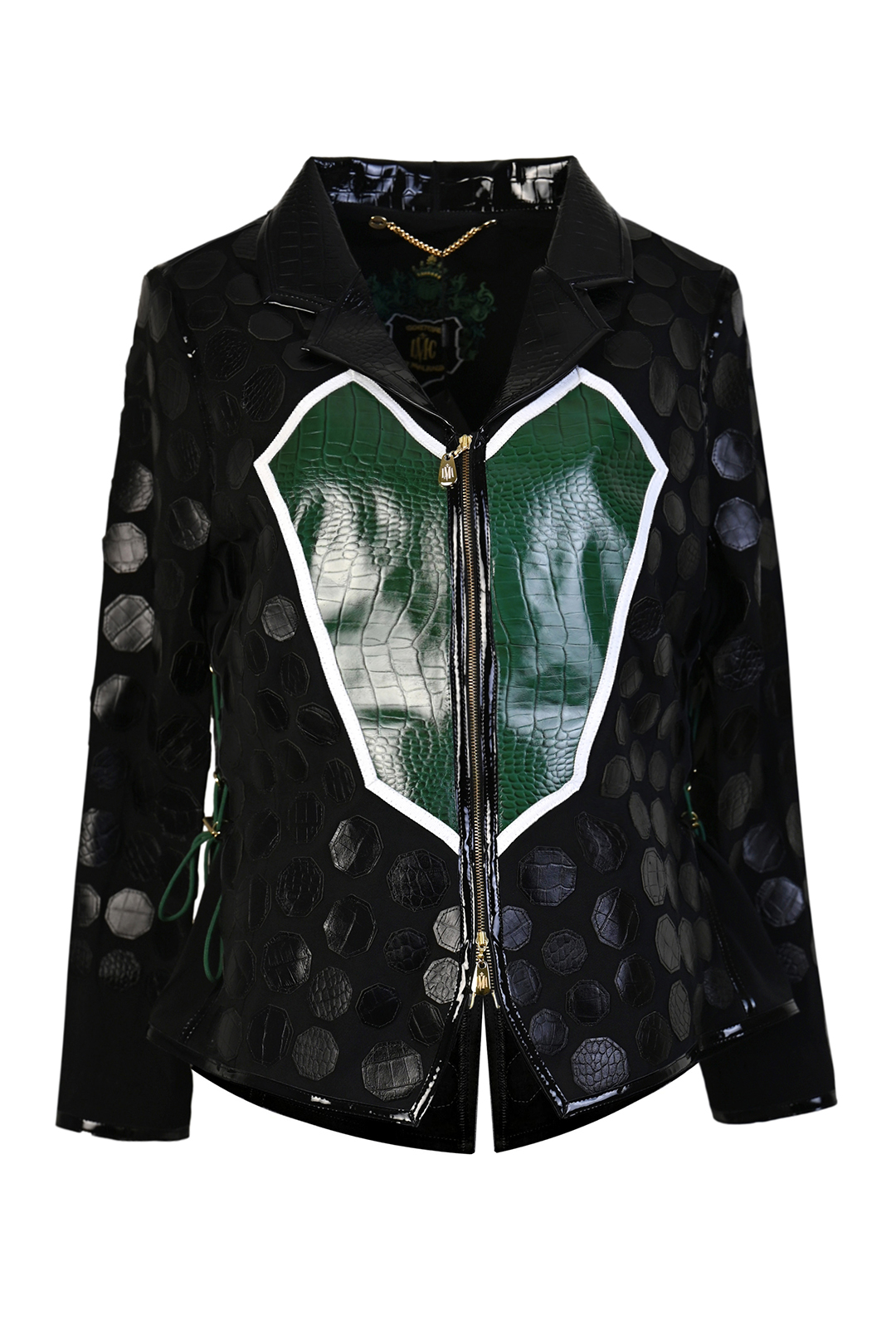 Haute Couture-Jacke mit smaragdgrünen Lederpatches in Kroko-Optik, und mit 134 Kristallen in Onyx und Smaragd entlang der Kanten umsäumt