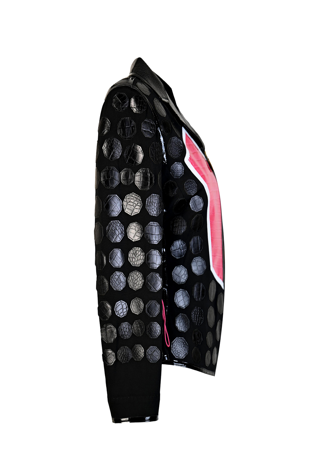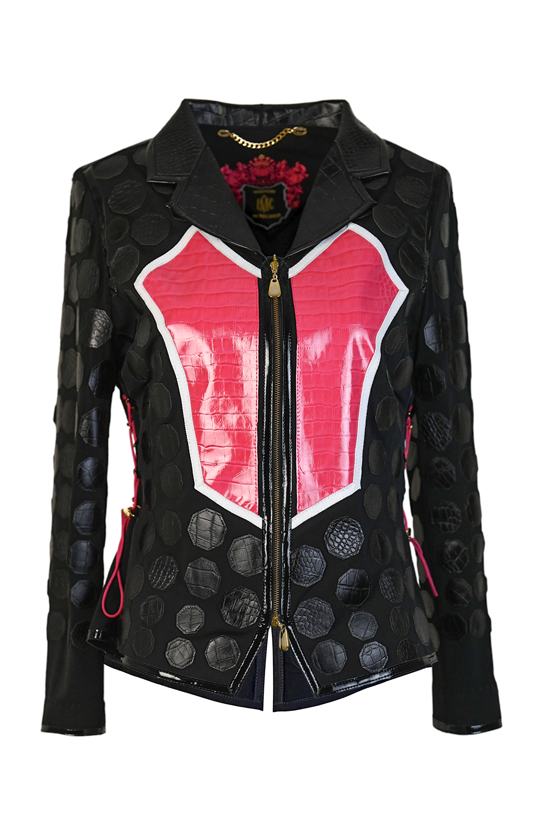 Jacke in schwarz, mit Vorderteileinsatz aus Leder in Kroko-Optik in flamingo, weißen Kontrasten