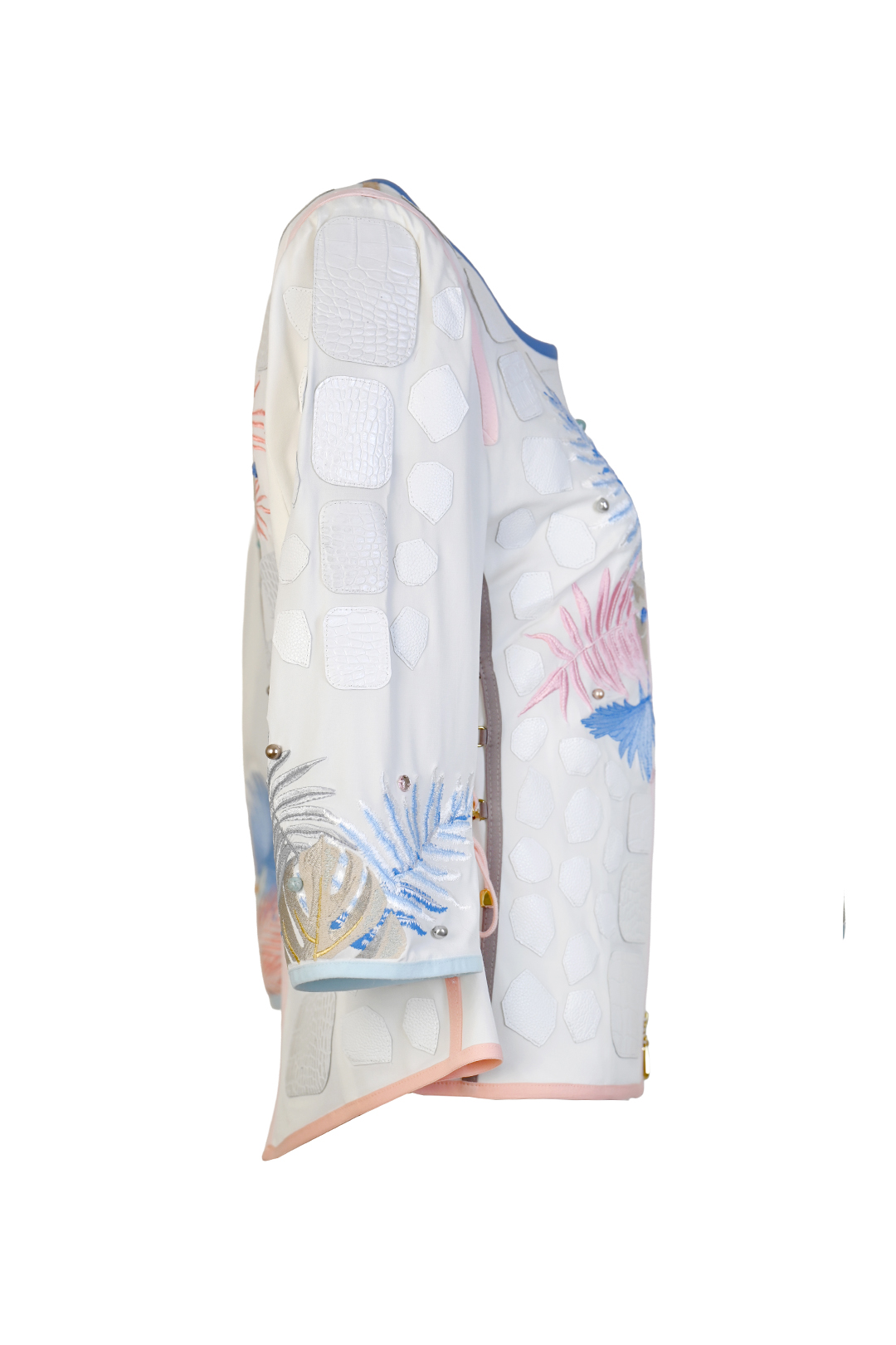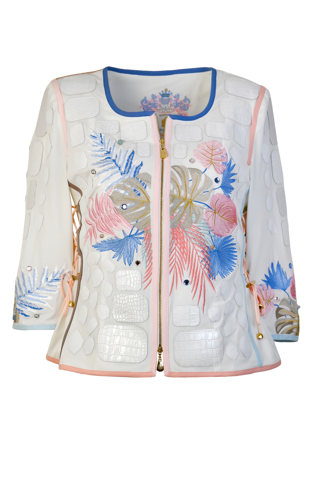 Couture Jacke mit “amazonas-embroidery”, 4 Motive, Lederpatches und mit 30 Kristallen handappliziert, 3/4 Ärmel