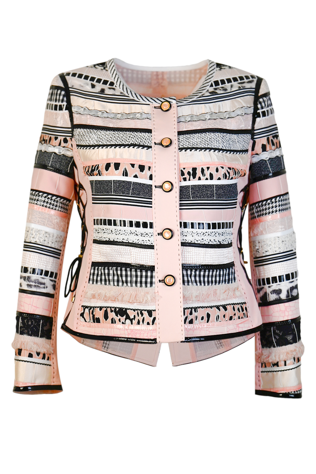 Jacke aus elastischer Spitze mit 10 Zierknöpfen, schwarzen Lackkontrasten und Lederpatches in Kroko-Optik und Kristallen, Kurzarm