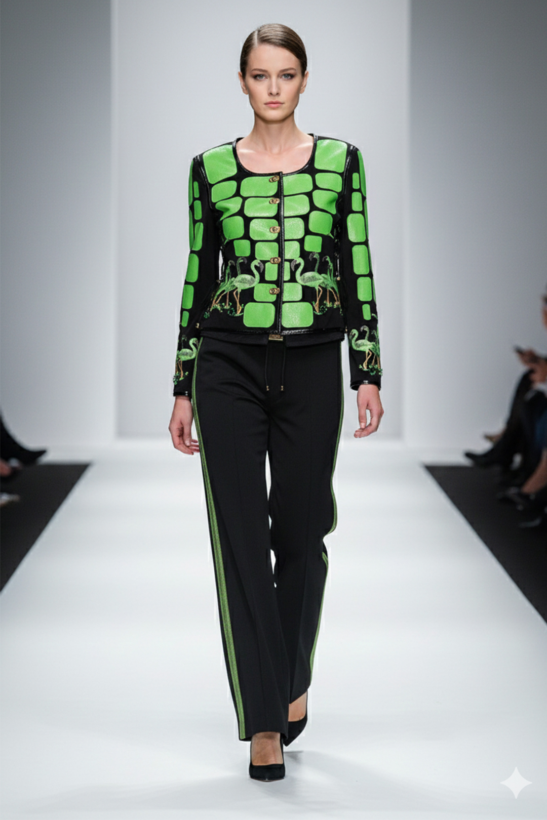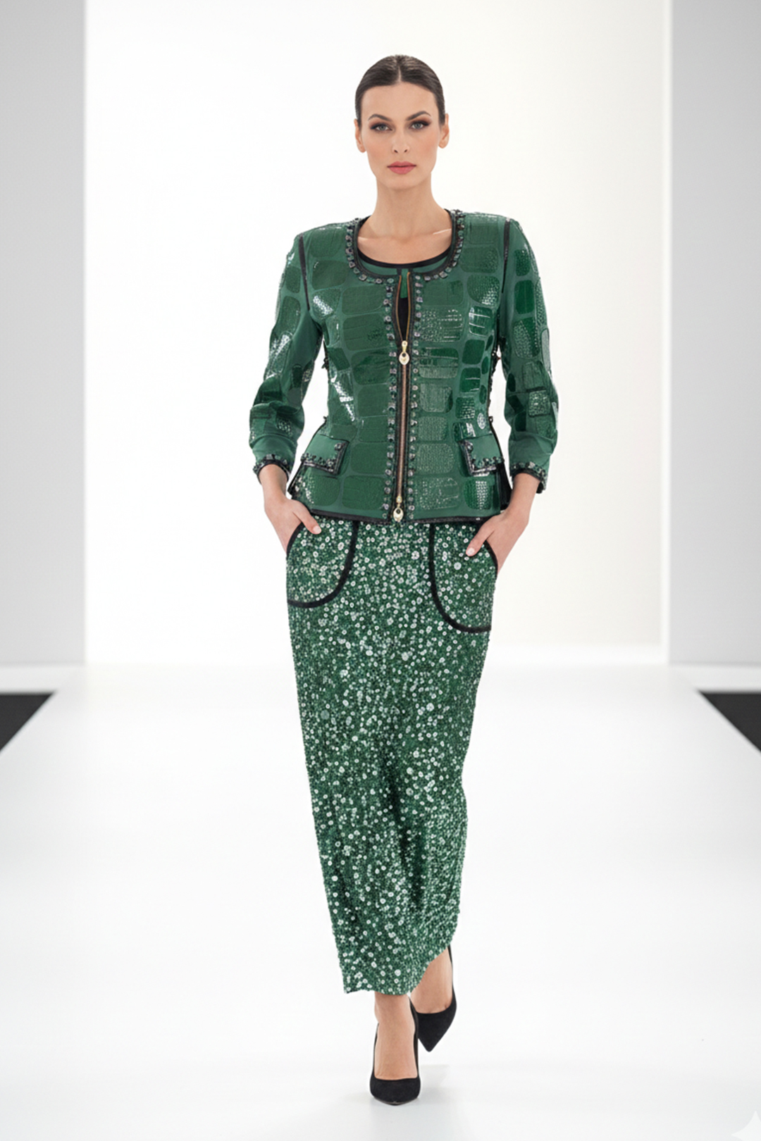 Haute Couture-Jacke mit smaragdgrünen Lederpatches in Kroko-Optik, und mit 134 Kristallen in Onyx und Smaragd entlang der Kanten umsäumt