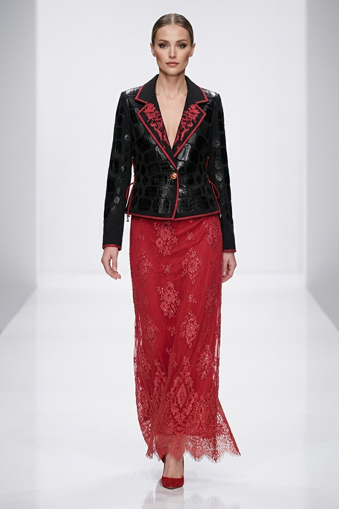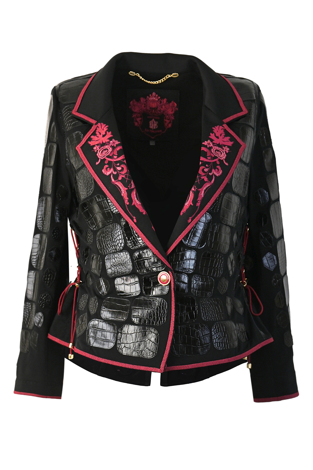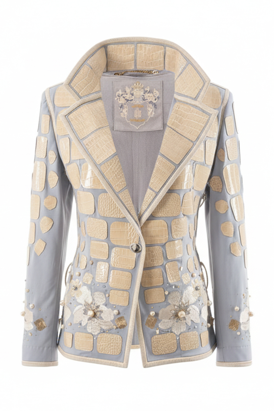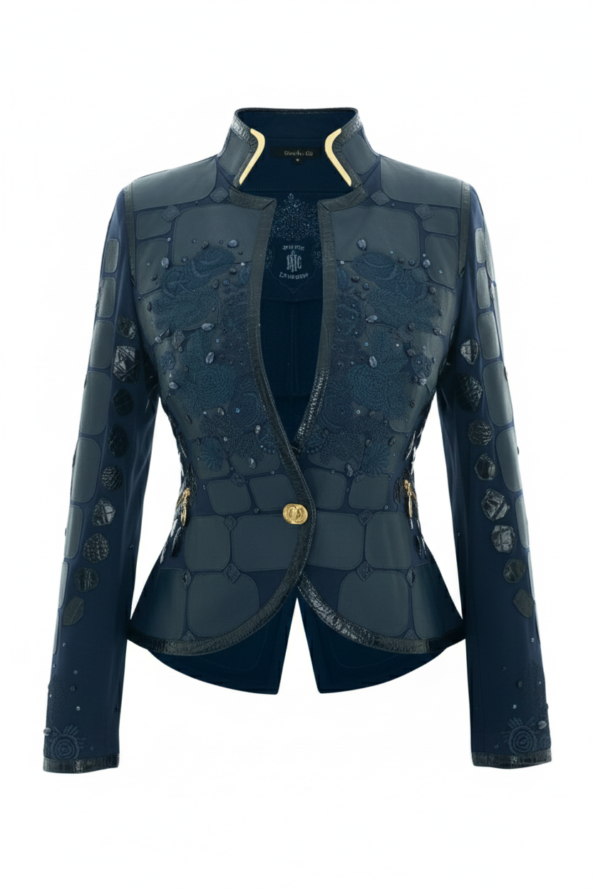 Couture-Longblazer mit “lace-embroidery”- 6 Motive (207000 Stich.), 320 handapplizierten Kristallen und Natursteinen, Lederpatches in Kroko-Optik,