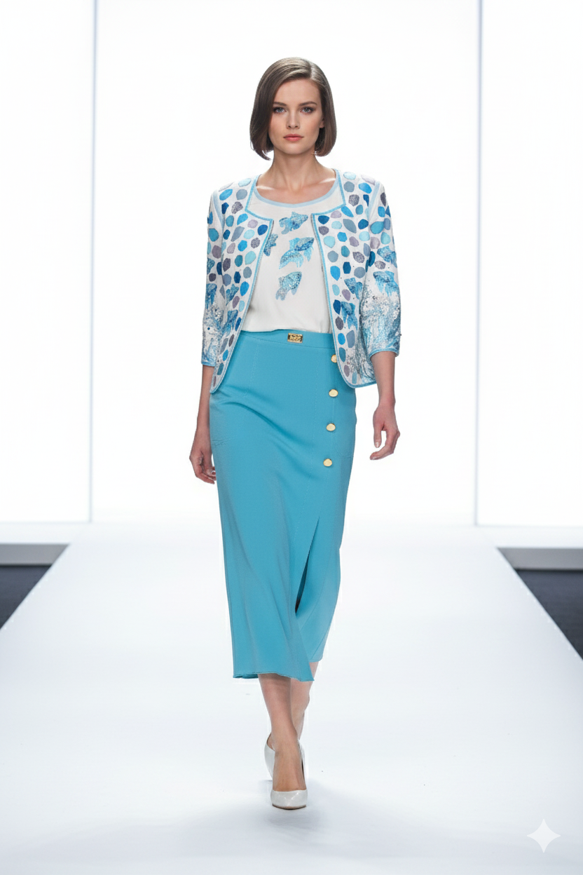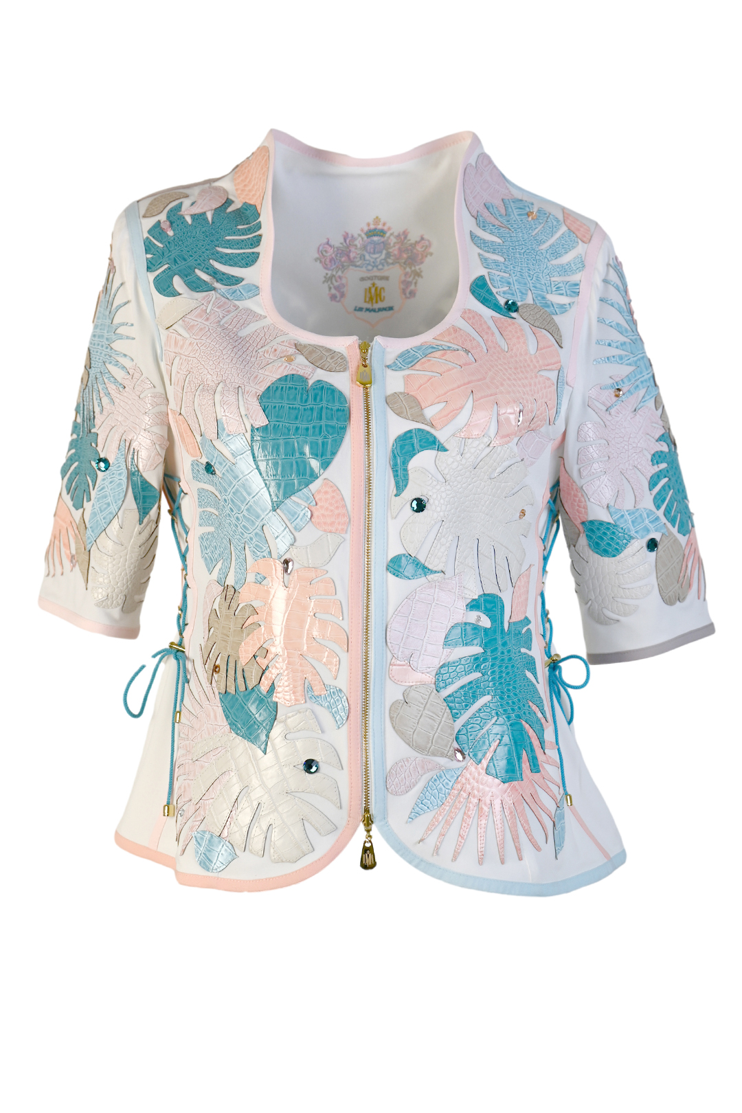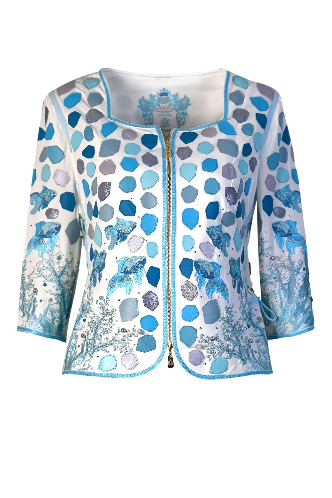 Couture-Jacke mit “ocean embroidery“, Diamant-Patches in Aqua-Tönen, handappliziert mit Kristallen und Perlen, 3/4-Ärmel