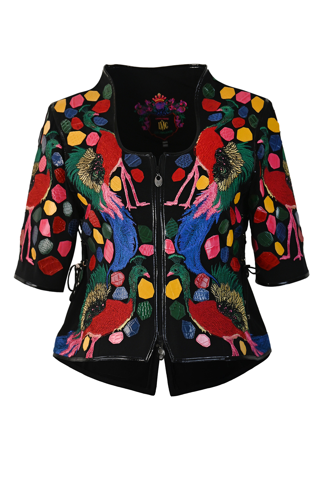 Couture Jacke mit “amazonas-embroidery”, 4 Motive, Lederpatches und mit 30 Kristallen handappliziert, 3/4 Ärmel