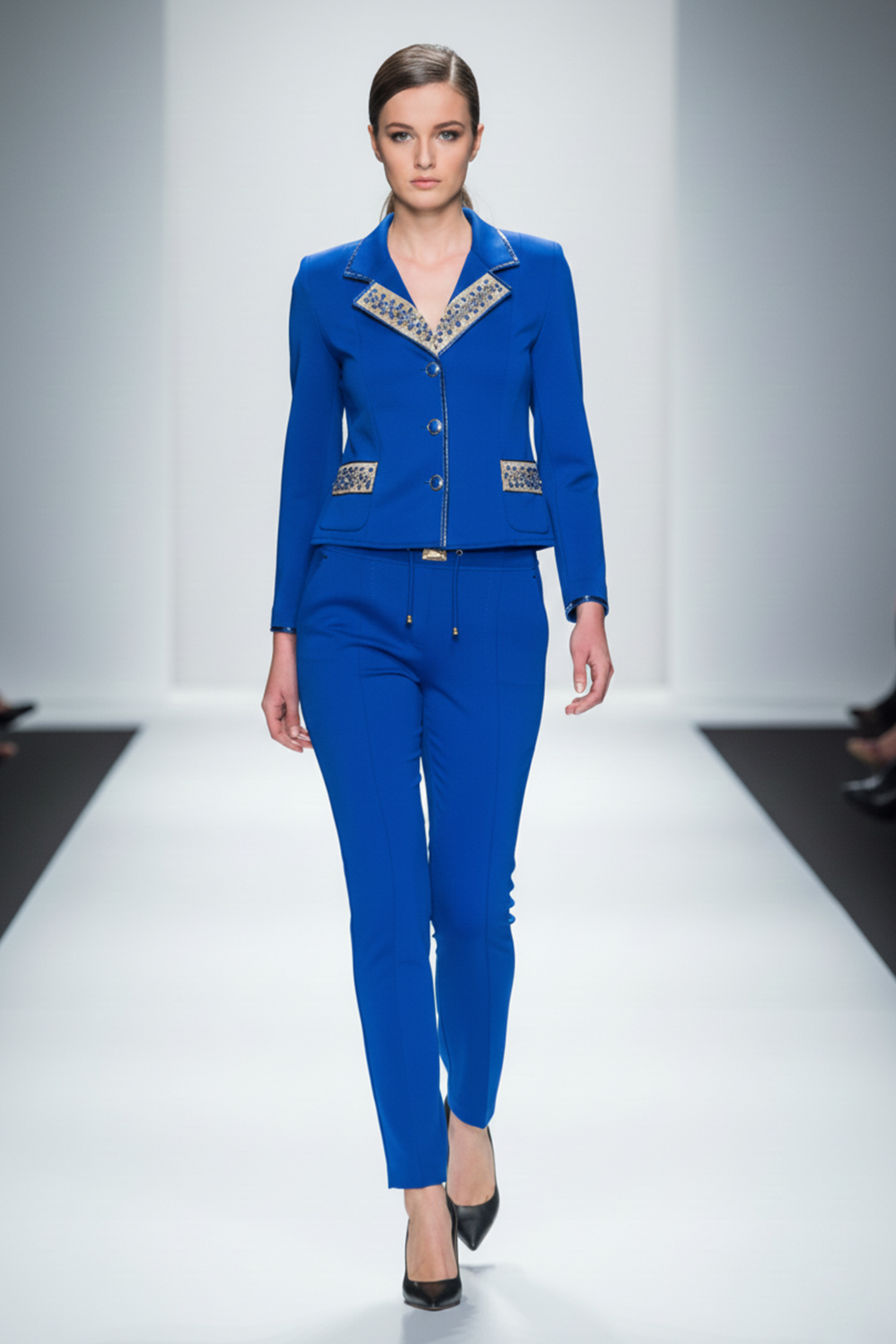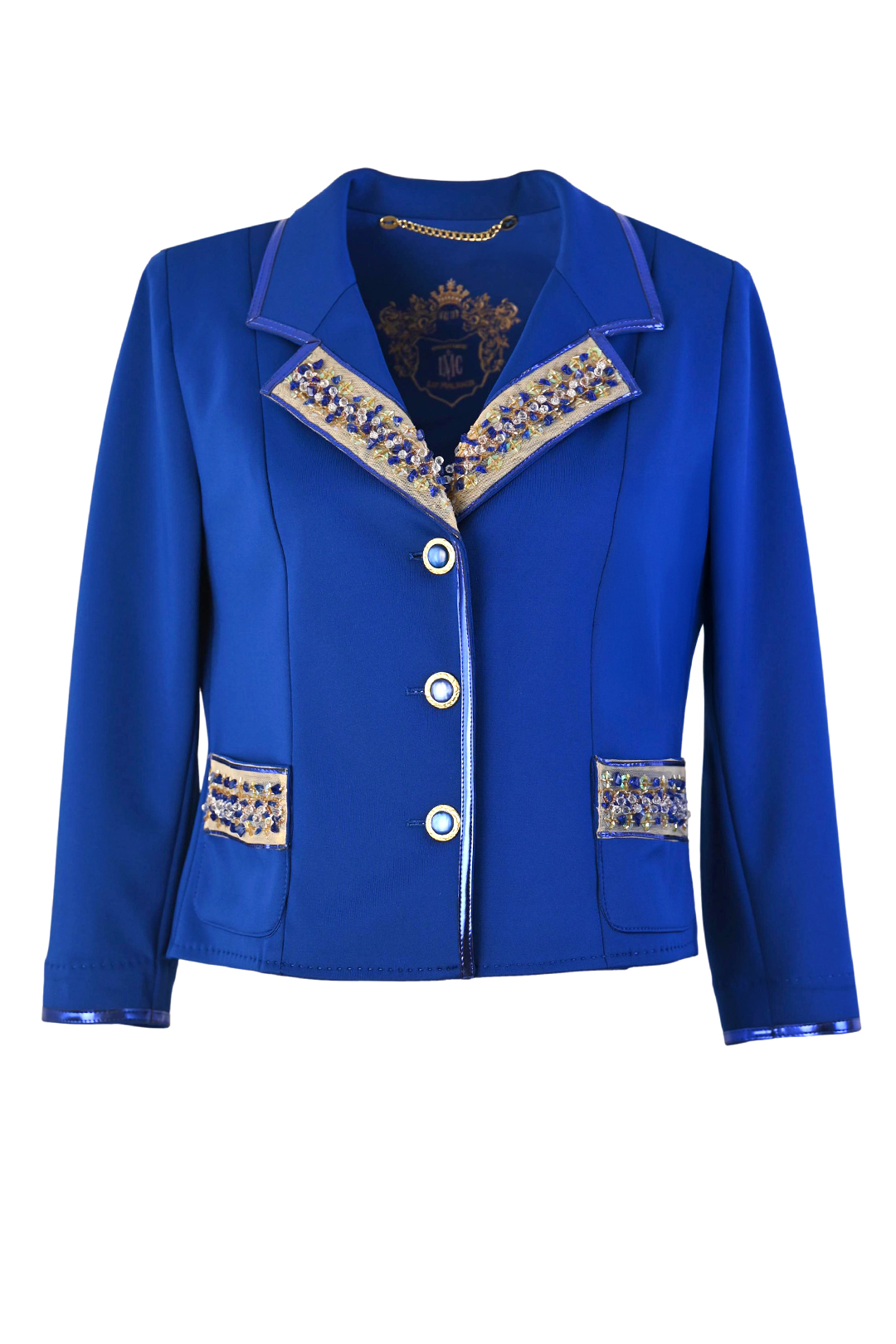 Haute Couture-Jacke aus royalblauem Doublejersey mit edler Kristallbordüre und feinen Lackstreifen an Revers und Taschen
