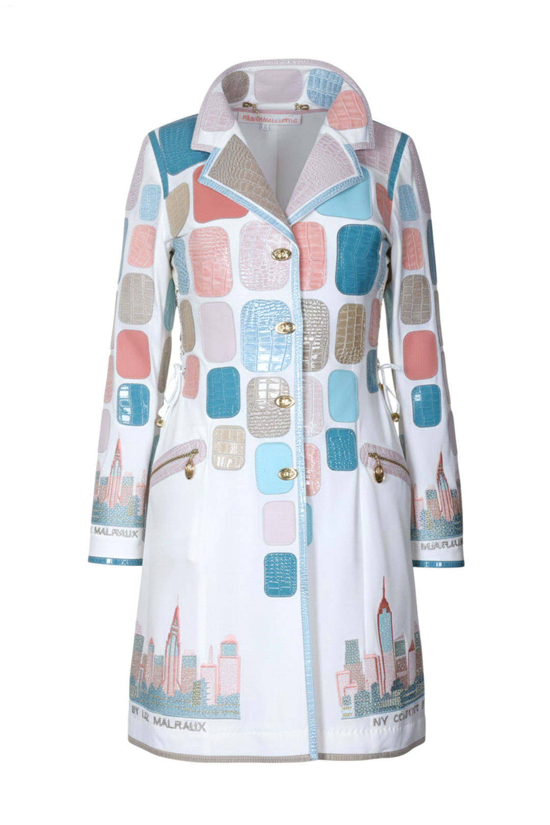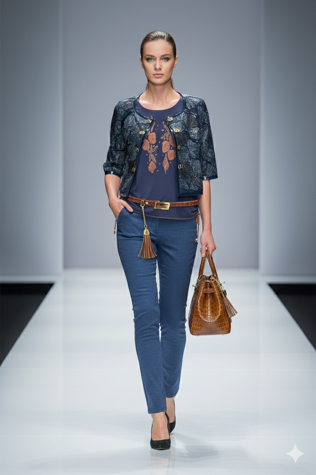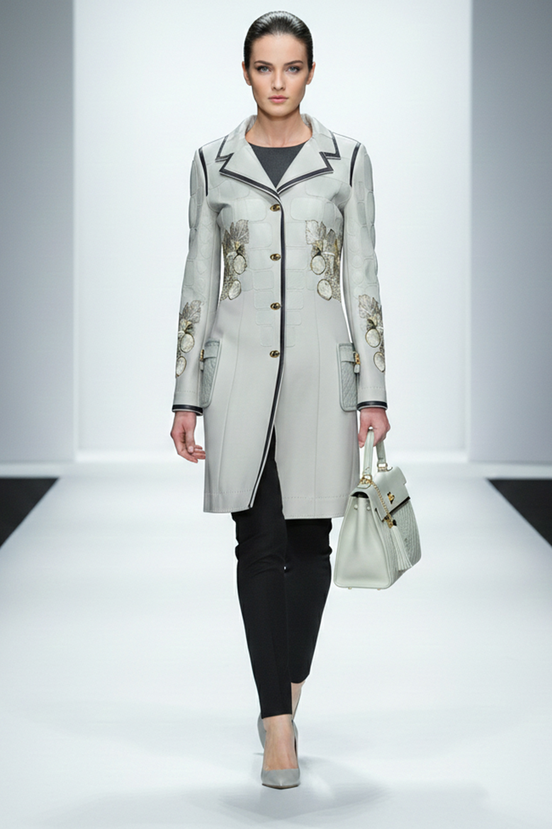 Longblazer, Brokat mit grau-blauen Kontrasten und Leder-Verbrämung