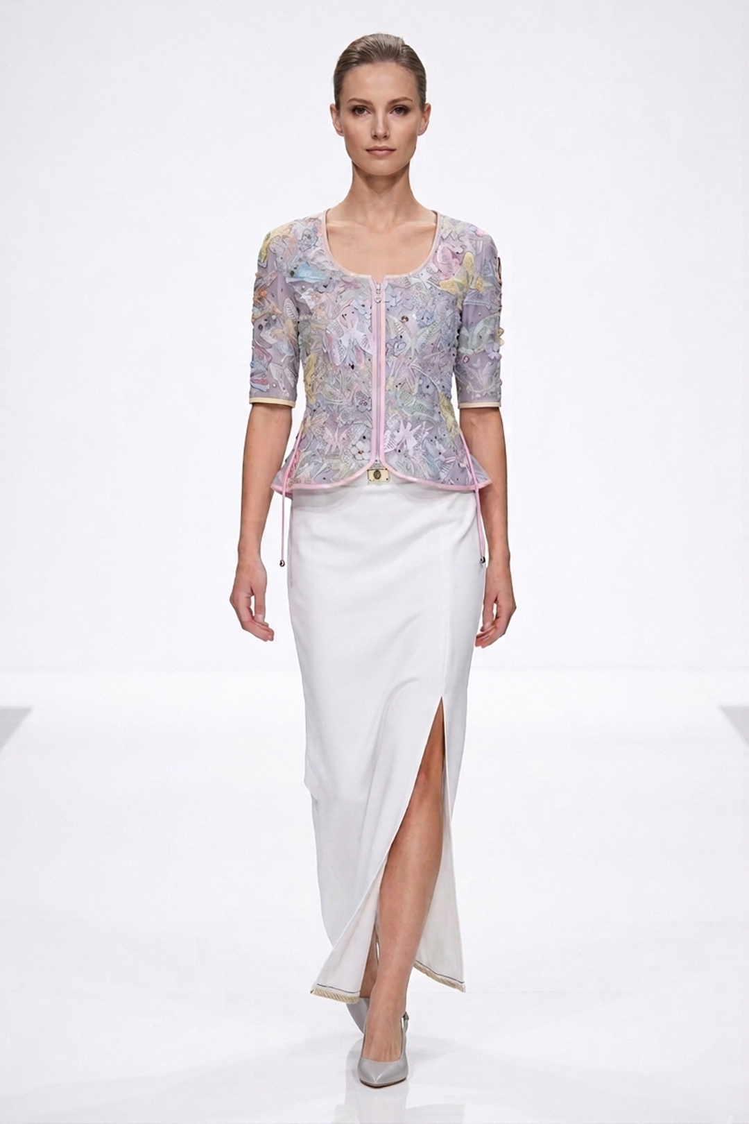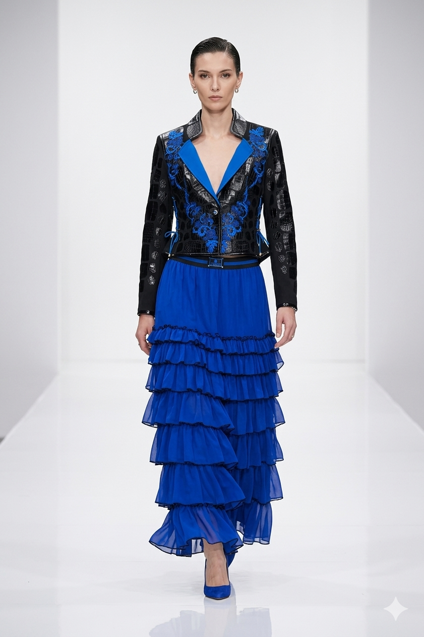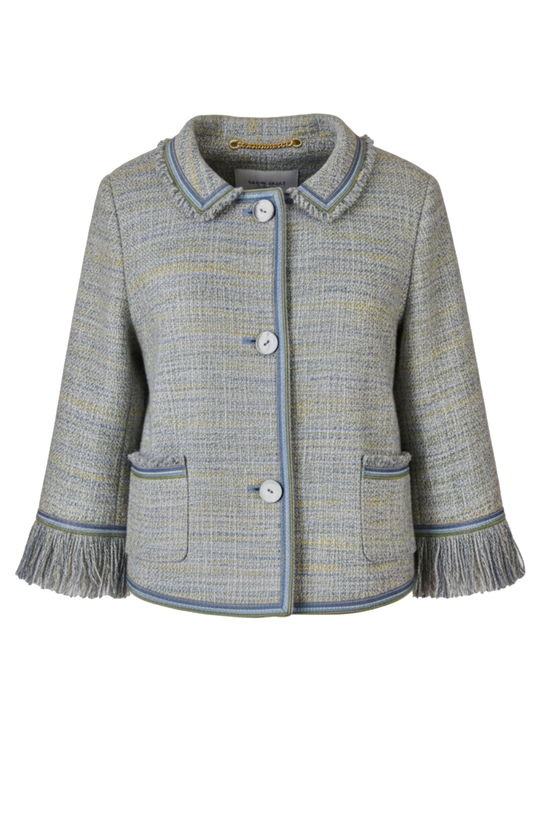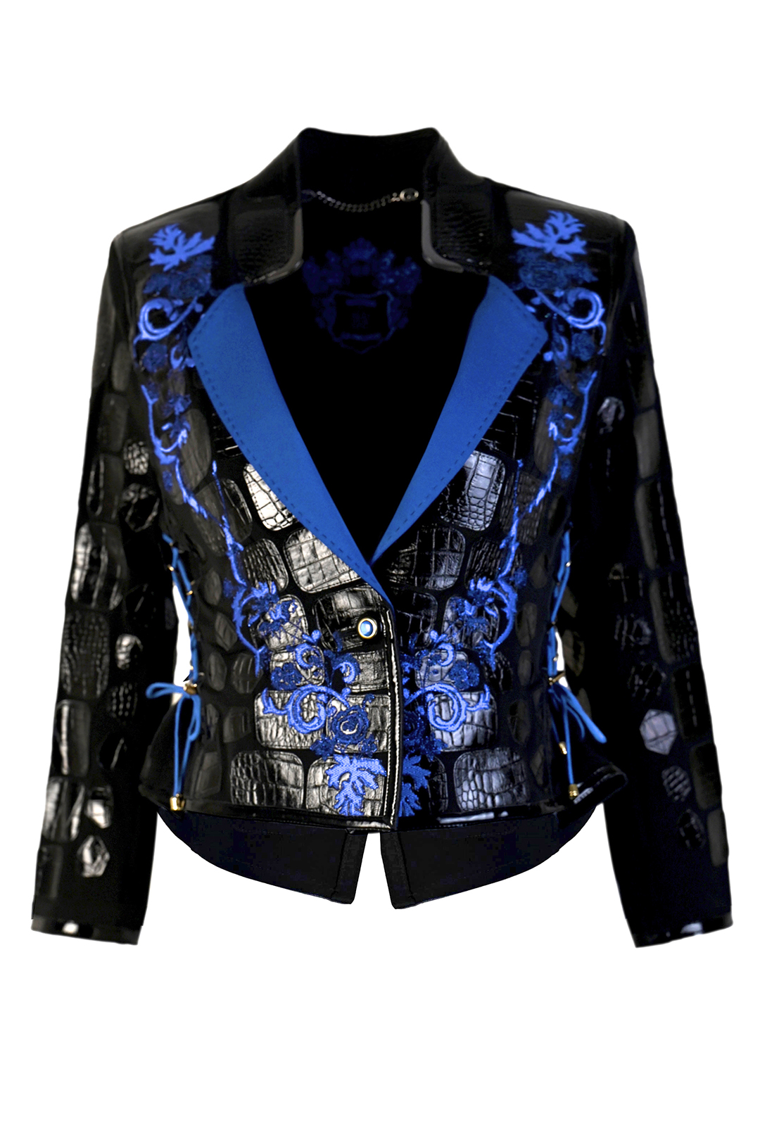 Couture-Jacke mit gestickter Passe, Brokat mit grau-blauen Kontrasten