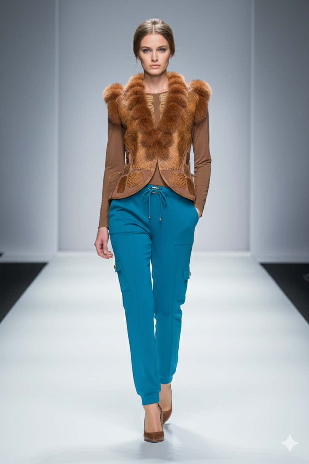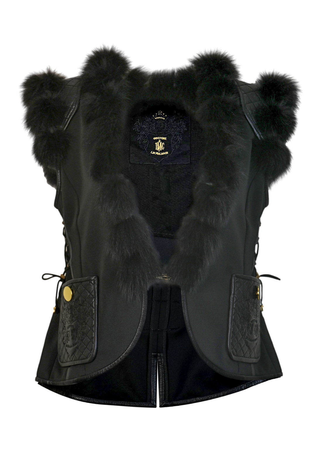 Weste aus Doublejersey mit geprägt gestickten Ledertaschen und Fuchsverbrämung, Multisize