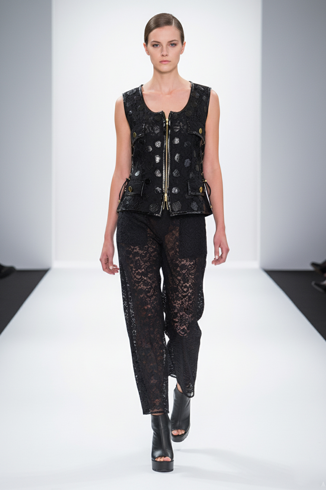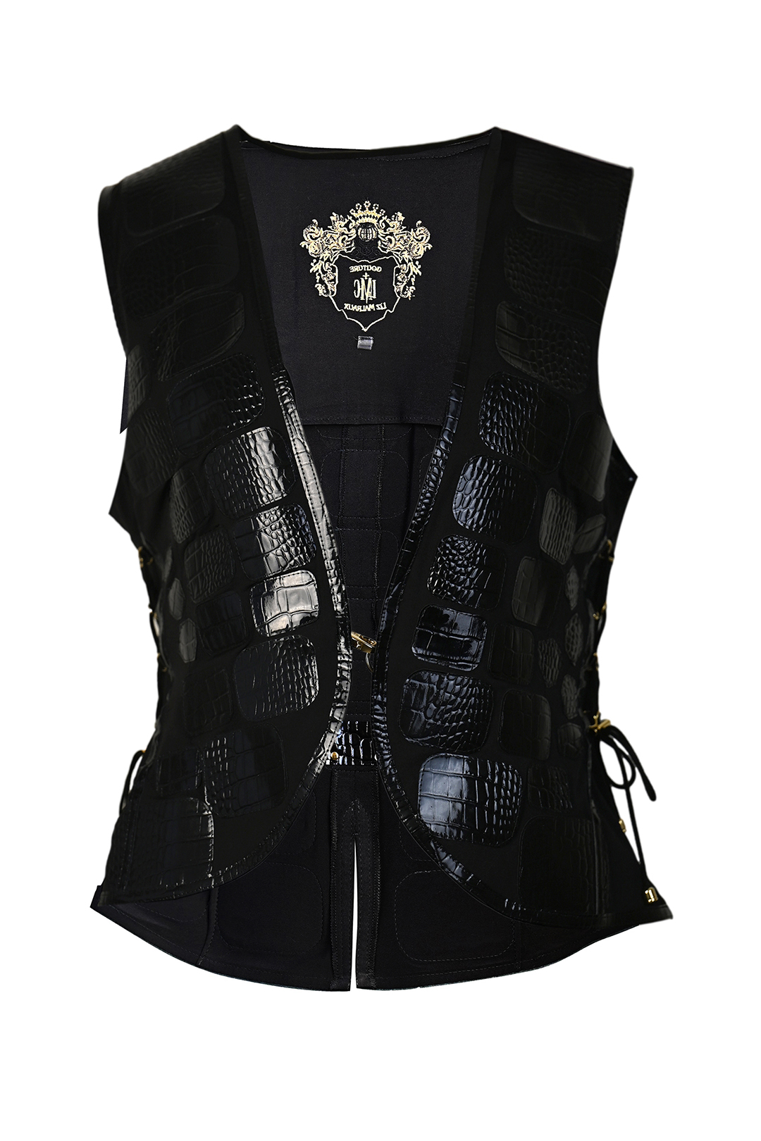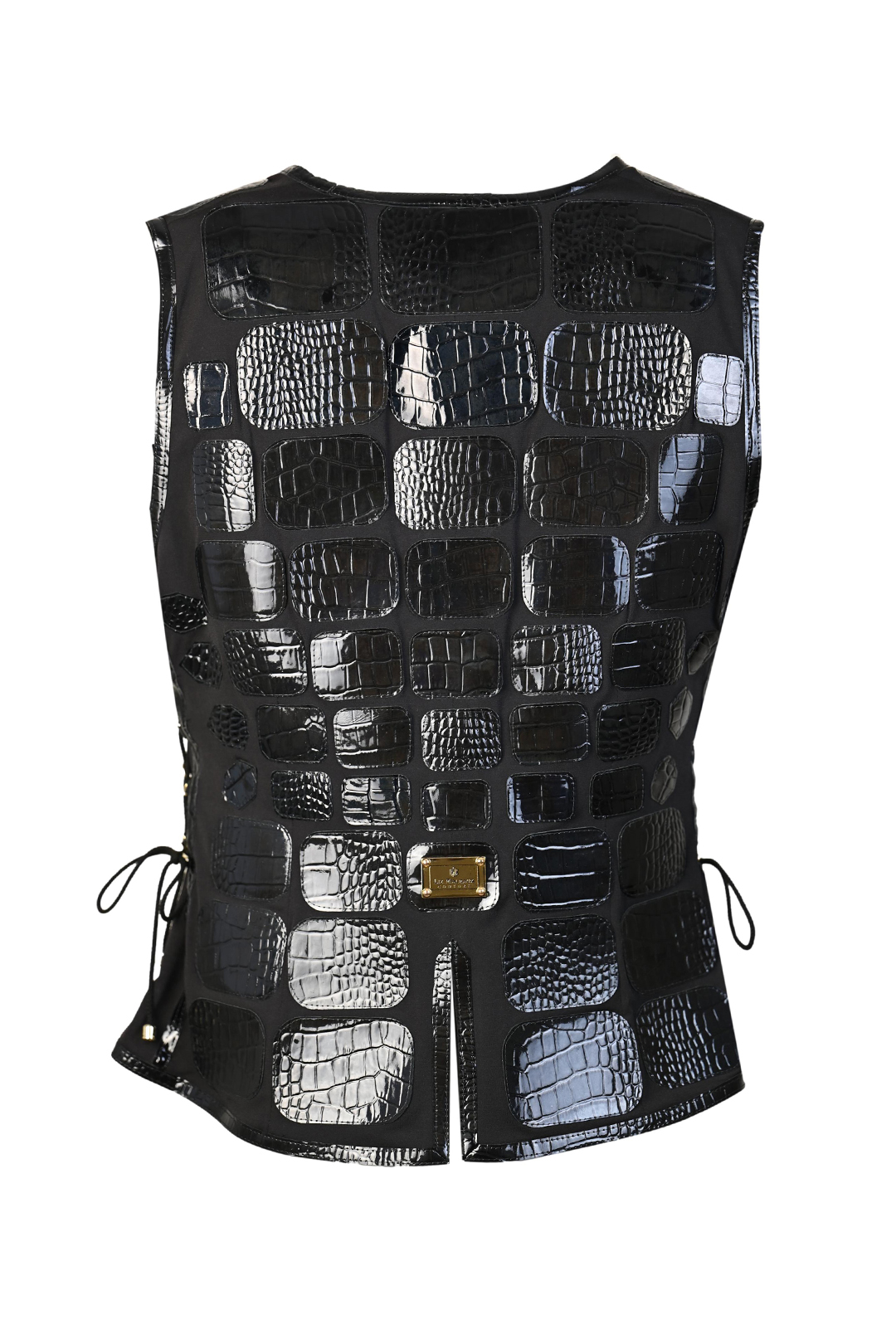 Weste mit 4 Patten und schwarzen Lackkontrasten aus elastischer Spitze, mit über 100 Lederpatches in Krokopoptik appliziert
