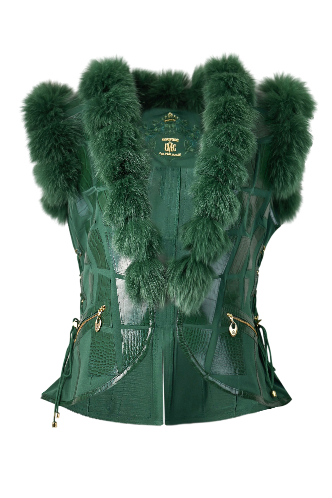 Weste mit 6 Motiven in “Royal-Clock-embroidery”, und 28 handapplizierten Perlen, 2 Motiven in “LMC-Heraldic-embroidery”, Lederpatches, Fuchsfellbesatz und Sicherheitstasche