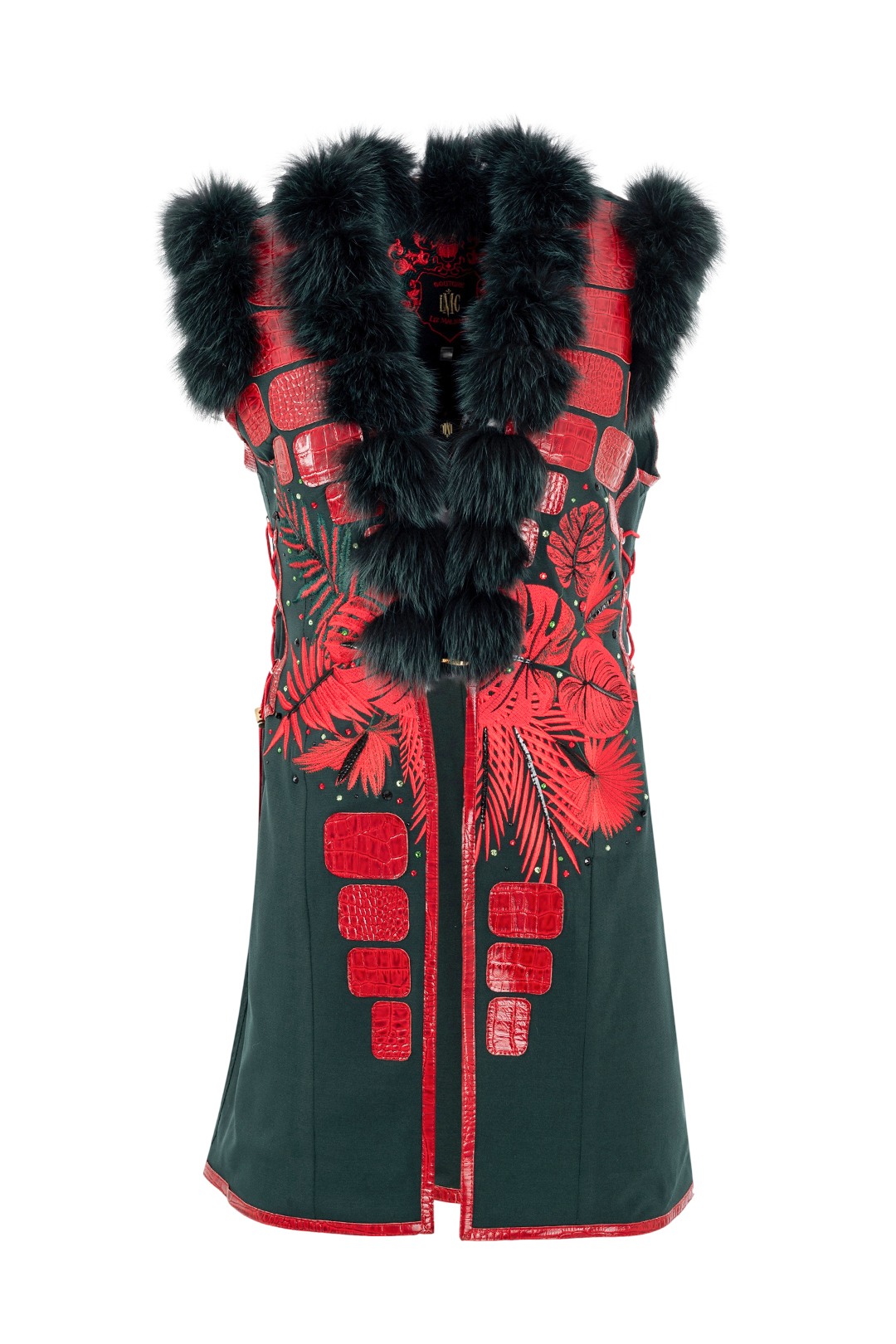 Longweste mit “amazonas-embroidery”, 162 Kristallen, Lederpatches in Kroko-Optik, Fuchsverbrämung, Multisize