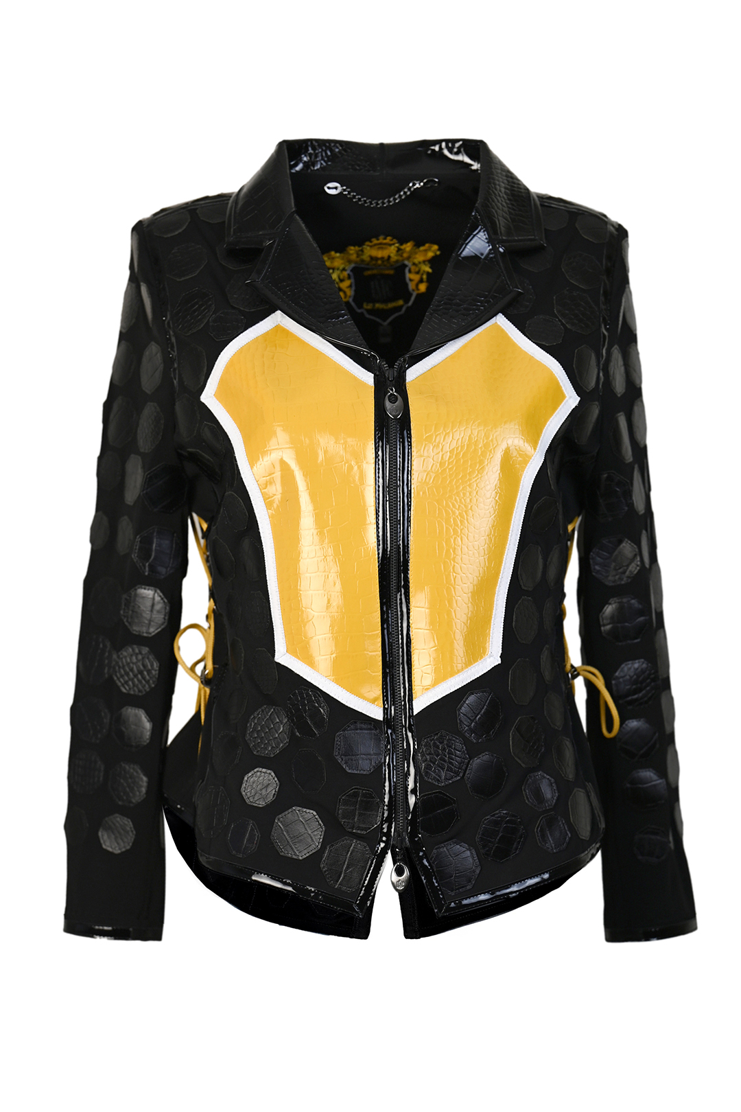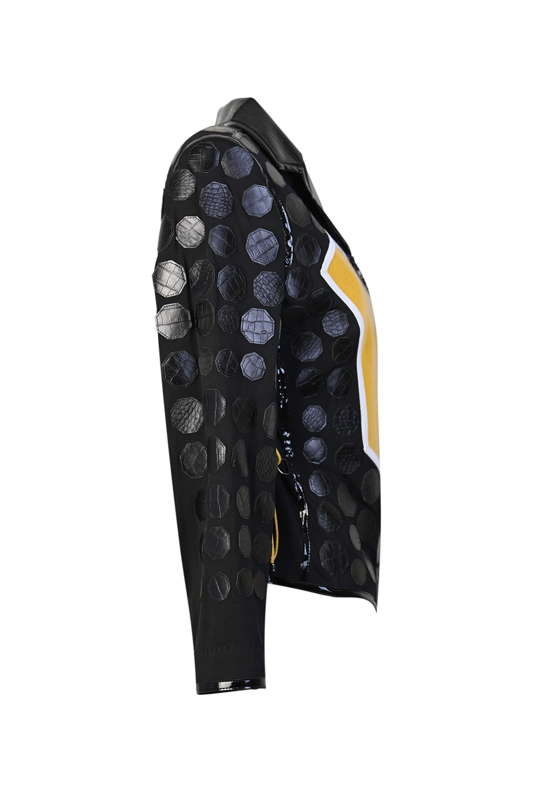 Jacke in schwarz, mit Vorderteileinsatz aus Leder in Kroko-Optik in gelb, weißen Kontrasten