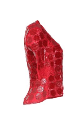 Jacke aus elastischer Spitze mit Lederpatches in Kroko-Optik und Kristallen, Kurzarm
