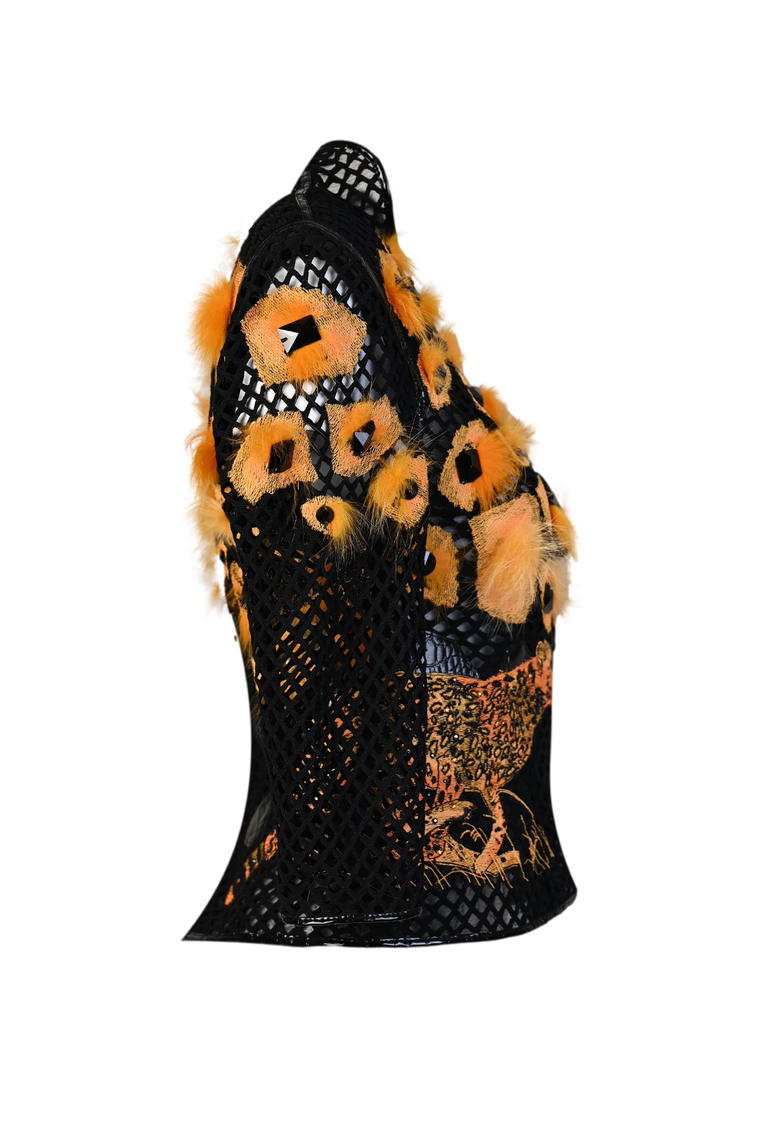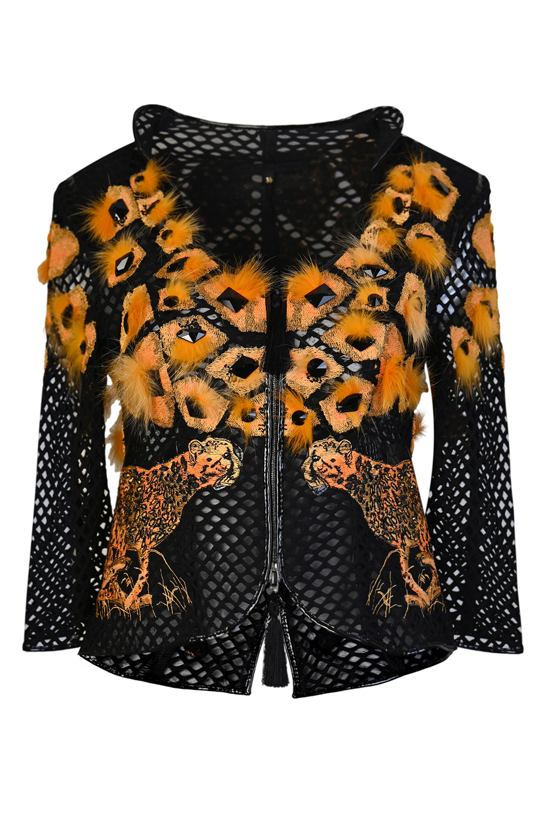 Couture-Jacke aus groben Mesh und Pelz, bestickt “animal” und “gepard embroidery”, handappitziert mit 78 Maxikristallen und 98 Hotfix von Swarovski