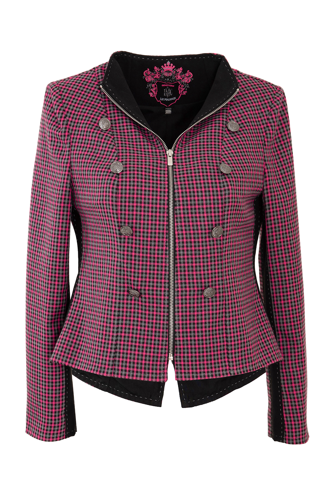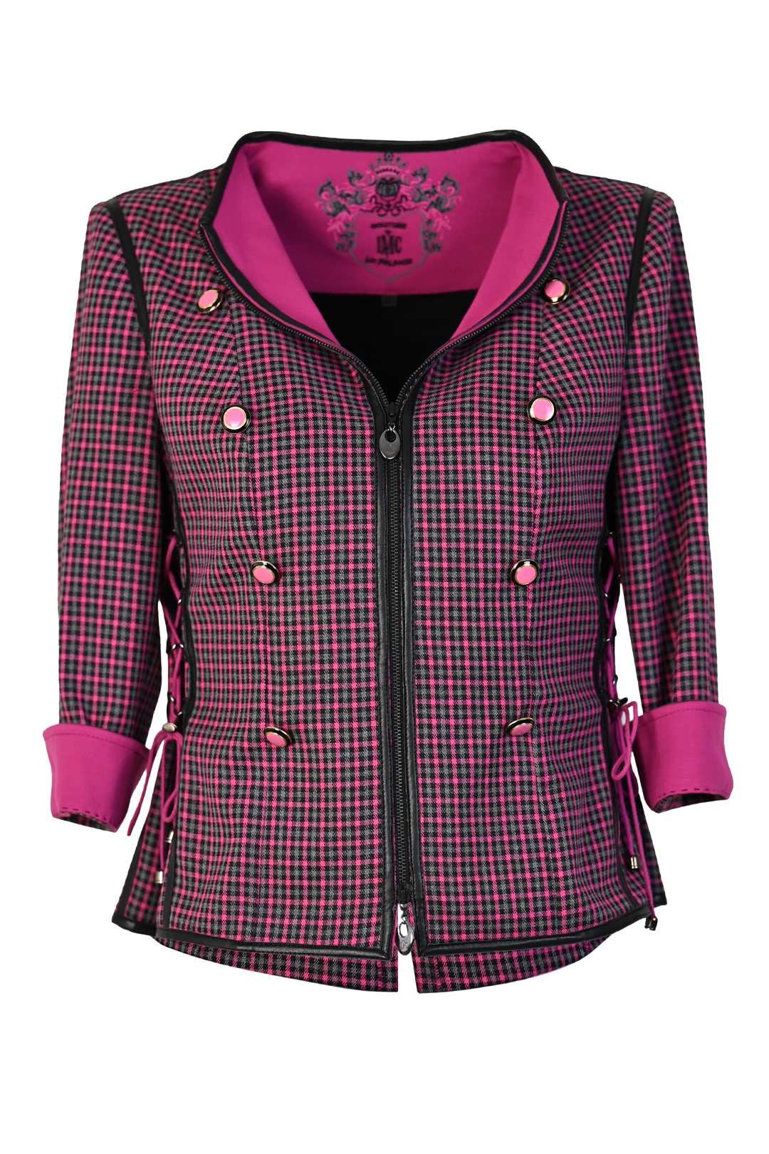 Spencerjacke aus pink-schwarzem Pepitastoff mit pinkfarbenen Kontrasten, 8 Zierknöpfen, 3/4-Ärmeln & Multisize-Schnürung