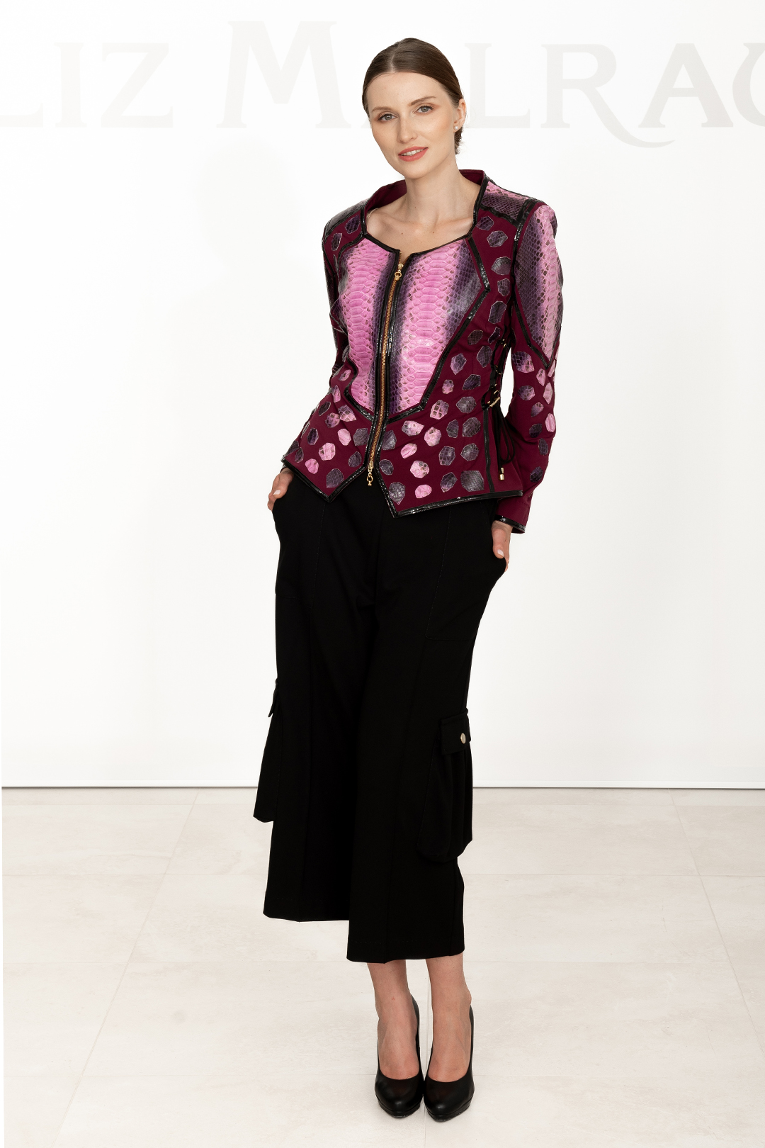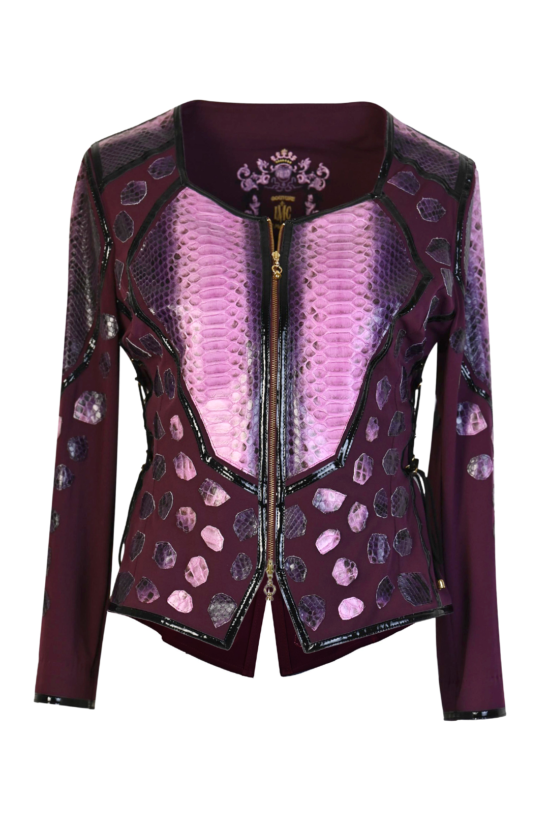 Jacke aus Cobraleder mit Ledereinsätzen, Diamantpatches und Lackkontrasten