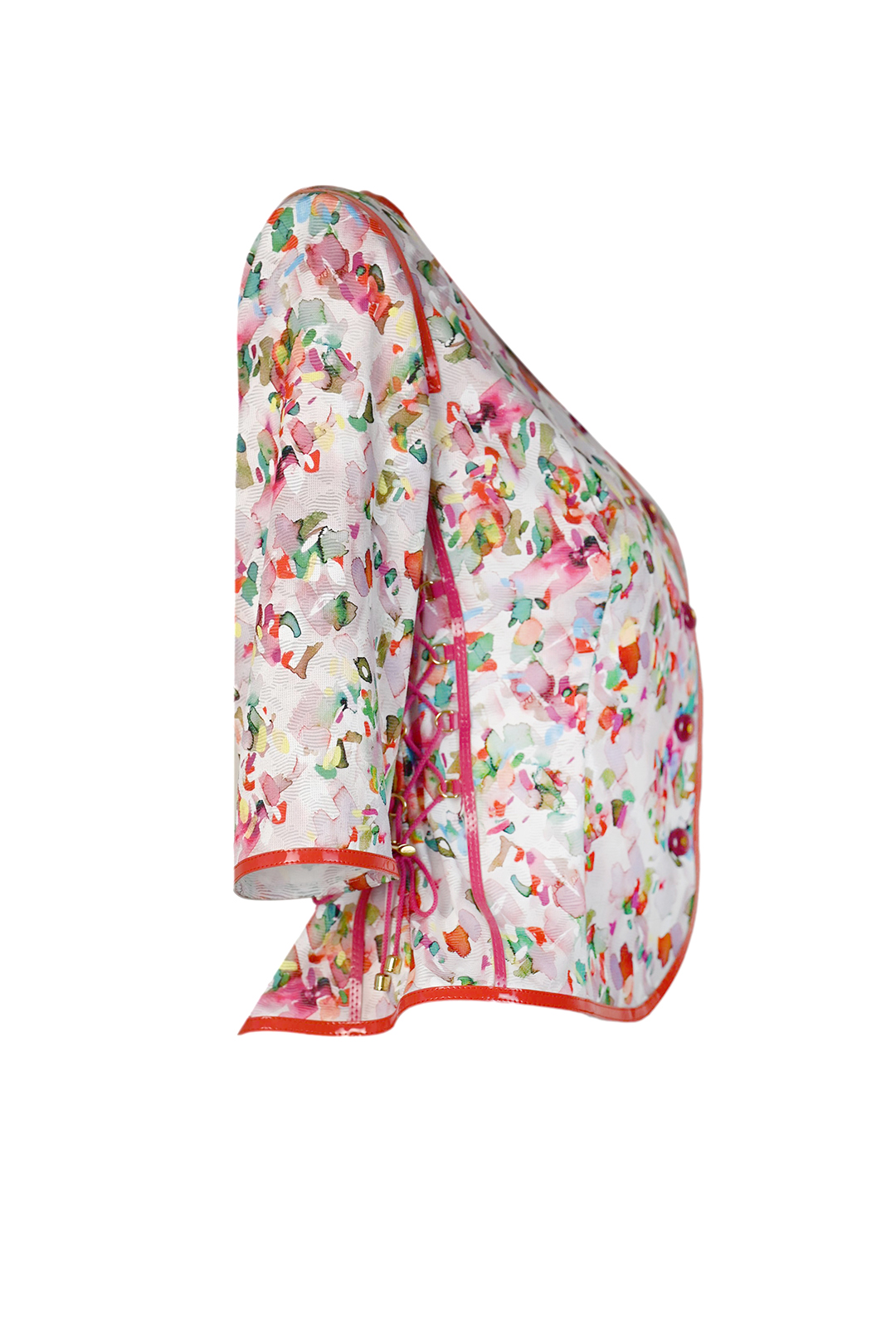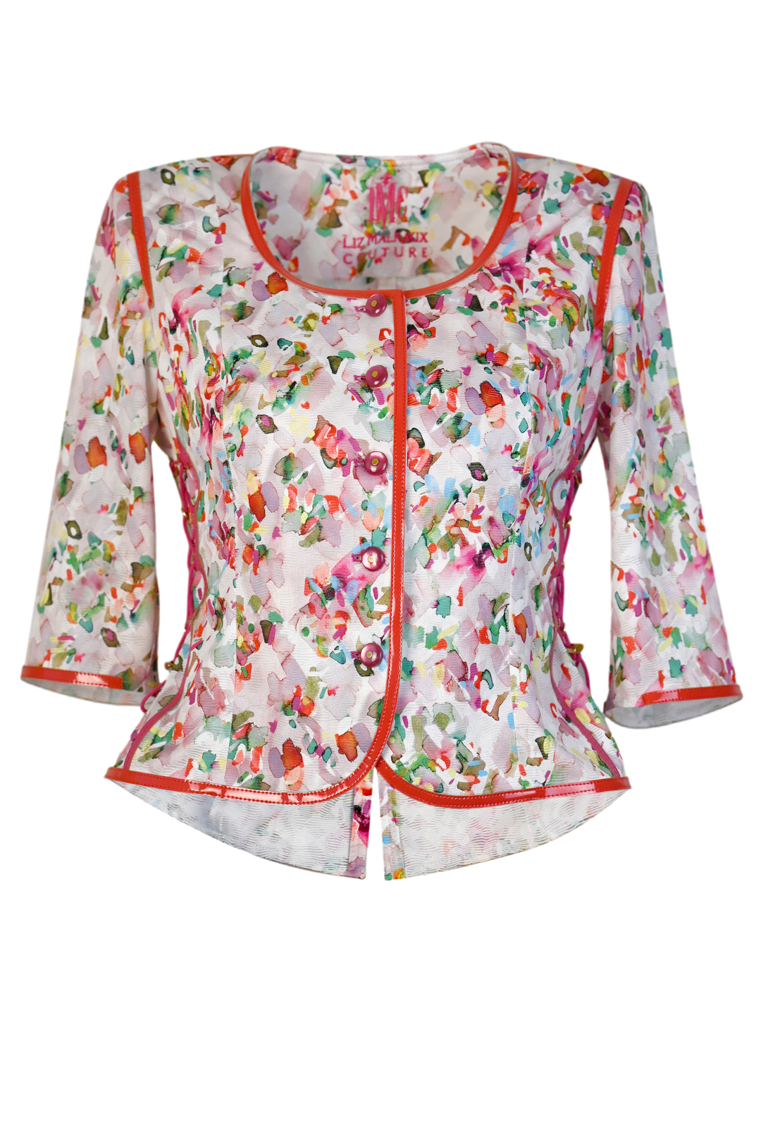 Blusenjacke in Calypsoprint auf elastischen Jaquard, mit Lackkontrasten, Kurzarm, Multisize
