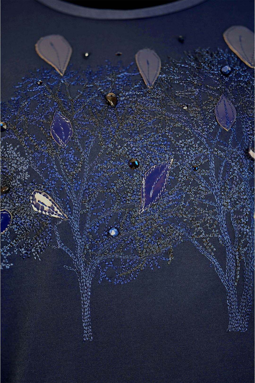 Kleid mit “baccara-embroidery”,Godetfalten, aplliziert mit Lederpatches in Kroko-Optik, Langarm, Multisize