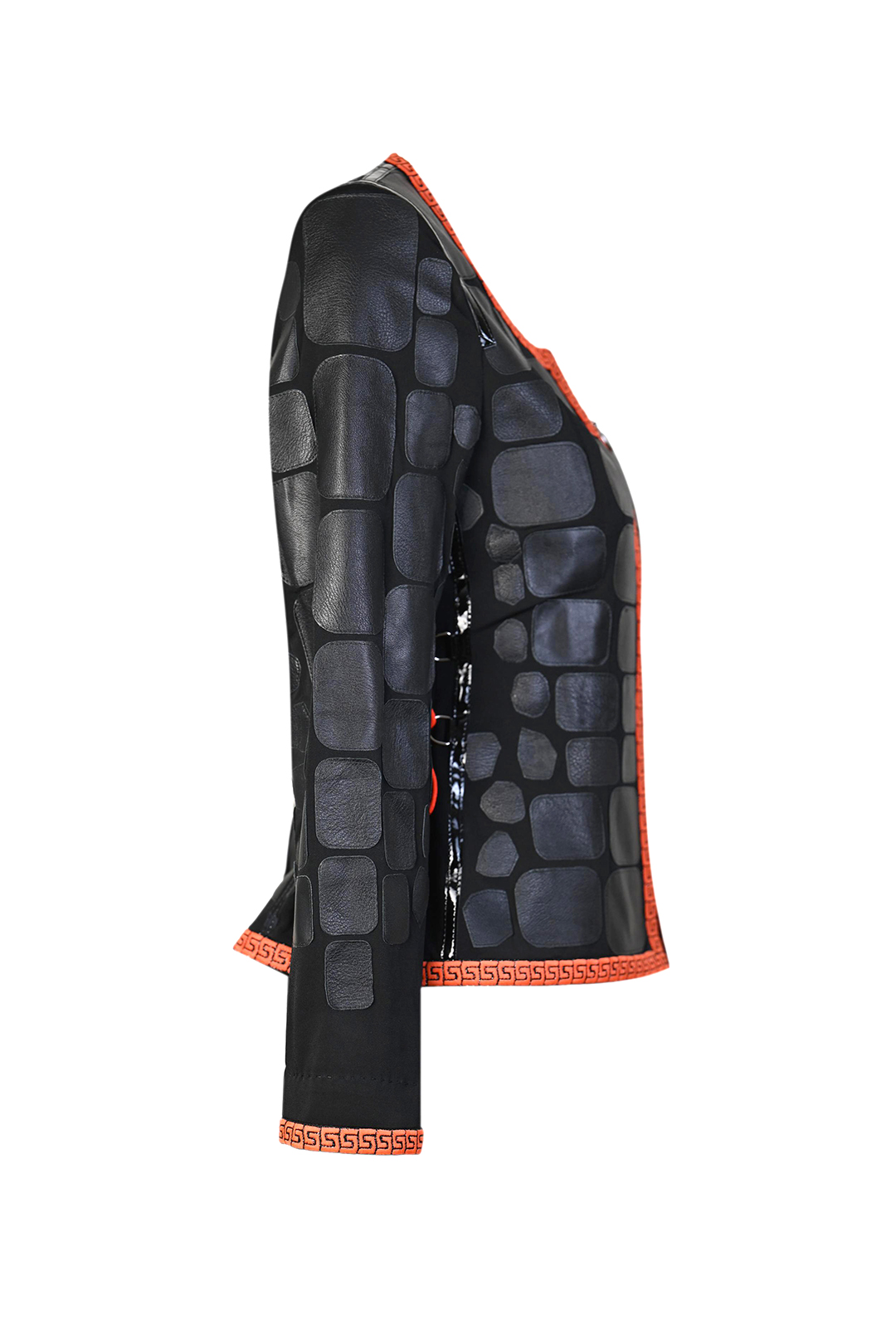 Jacke mit gestickter “Klassik-Bordüre”, und applizierten Nappalederpatches auf Single-Jersey. Langarm