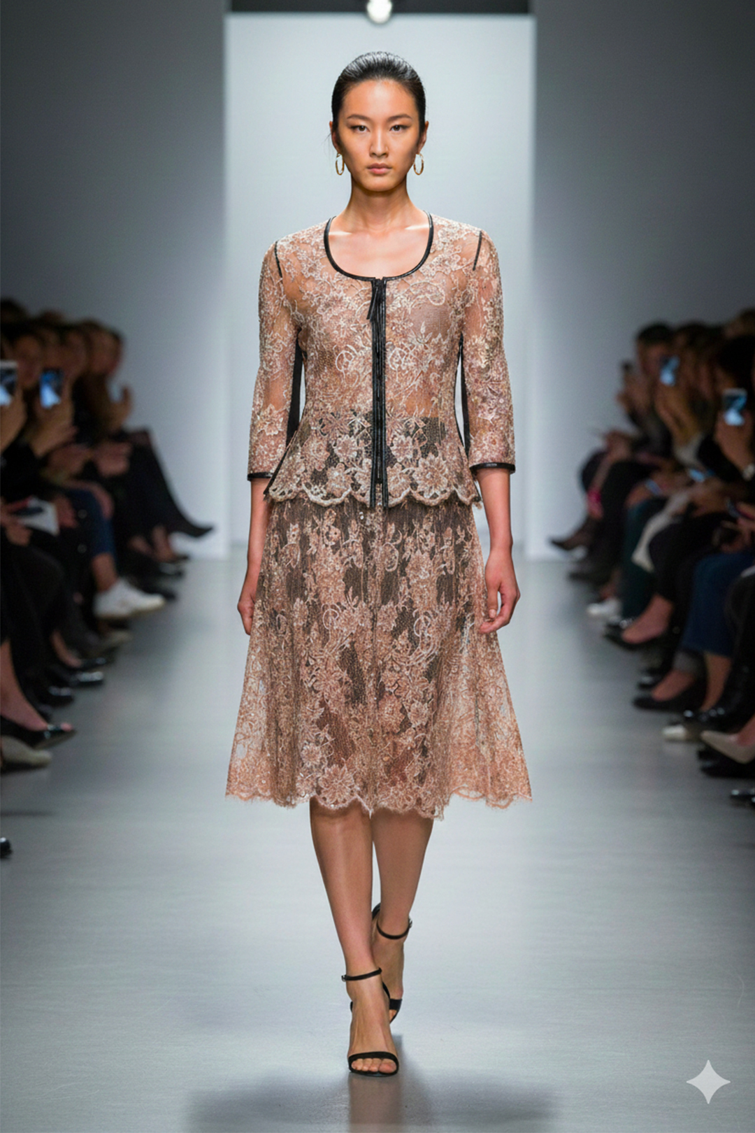 Haute-Couture-Kleid aus Spitze mit Rüschen und handapplizierten Patches, Kurzarm