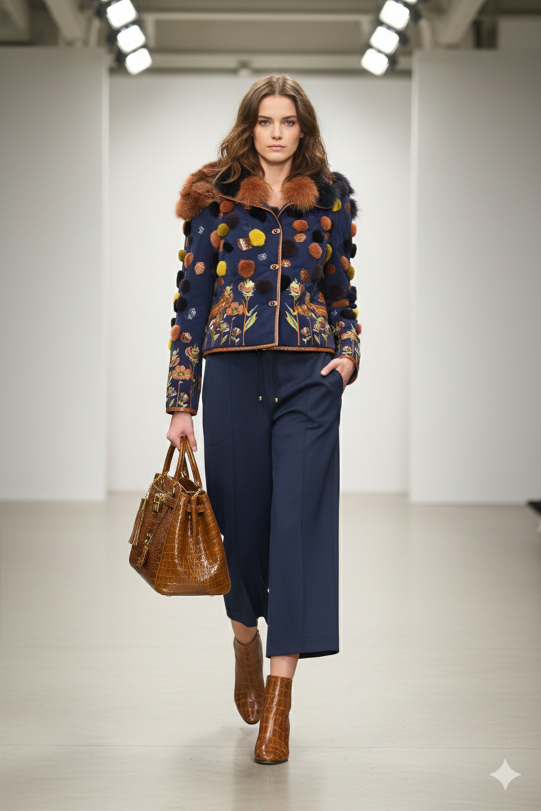 Pelzjacke mit “autumn meadow ” embroidery Applikationen aus geschorenem Fuchs und Leder in Kroko-Optik, RV-Taschen, wattiert