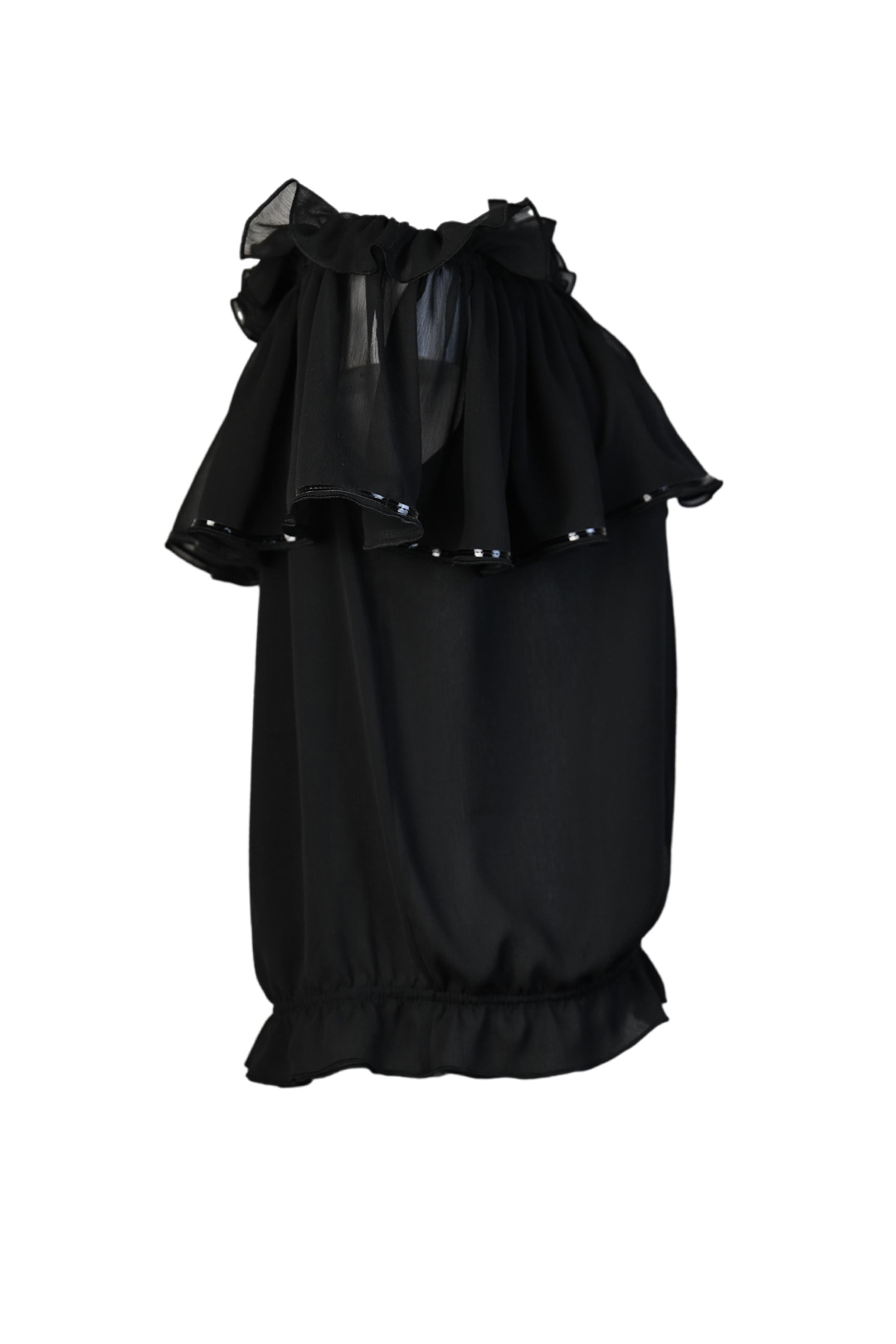 Carmenbluse mit breitem Volant und Bindeschleife, aus pflegeleichtem schwarzem Crash-Material. Doppelt unterlegt und mit glänzenden Lackkontrasten