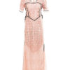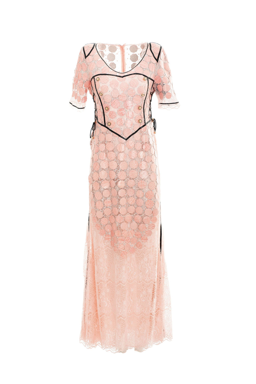 Abendkleid aus elastischer Spitze, mit schwarzen Lackkontrasten und 8 Zierknöpfen, Lederpatches in Kroko-Optik und Swarovski Kristallen,Kurzarm