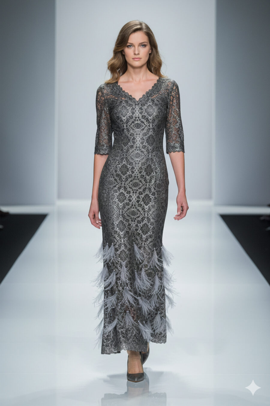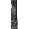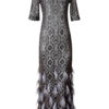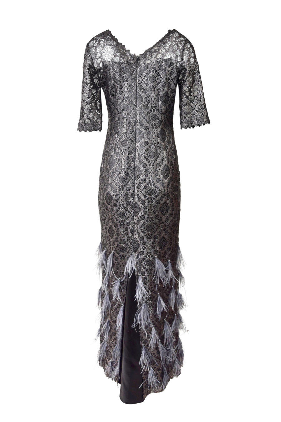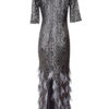 Das Kleid ist kunstvoll mit schimmernden Metallic-Pailletten bestickt und wird durch applizierte Straußenfeder-Quasten in Dark Silver ergänzt.