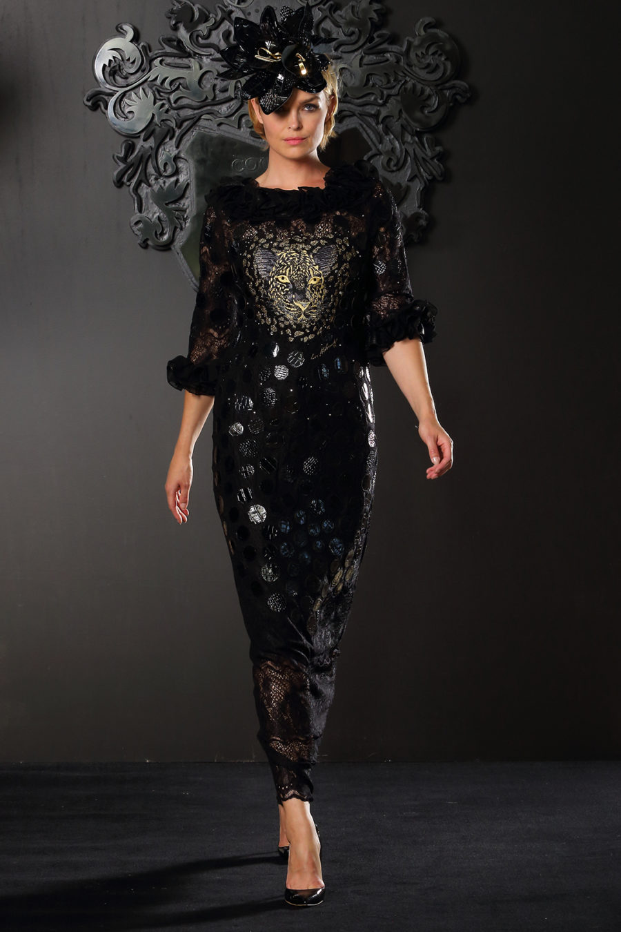 Abendkleid mit “animal-embroidery”, elastische Spitze mit Lederpatches in Kroko-Optik, Stehkragen, Langarm
