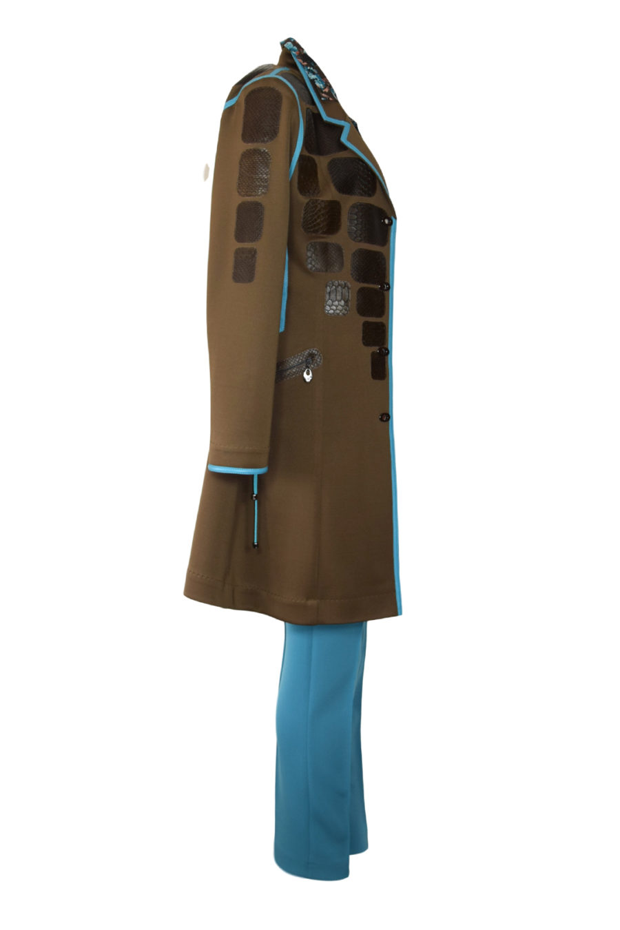 Longblazer oliv mit Kontrasten in türkis, Lederpatches in Kroko-Optik auf Doublejersey appliziert, Multisize