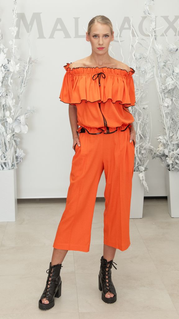 Carmenbluse aus Leinen mit breiten Volant, Lackkontrasten und Schleife