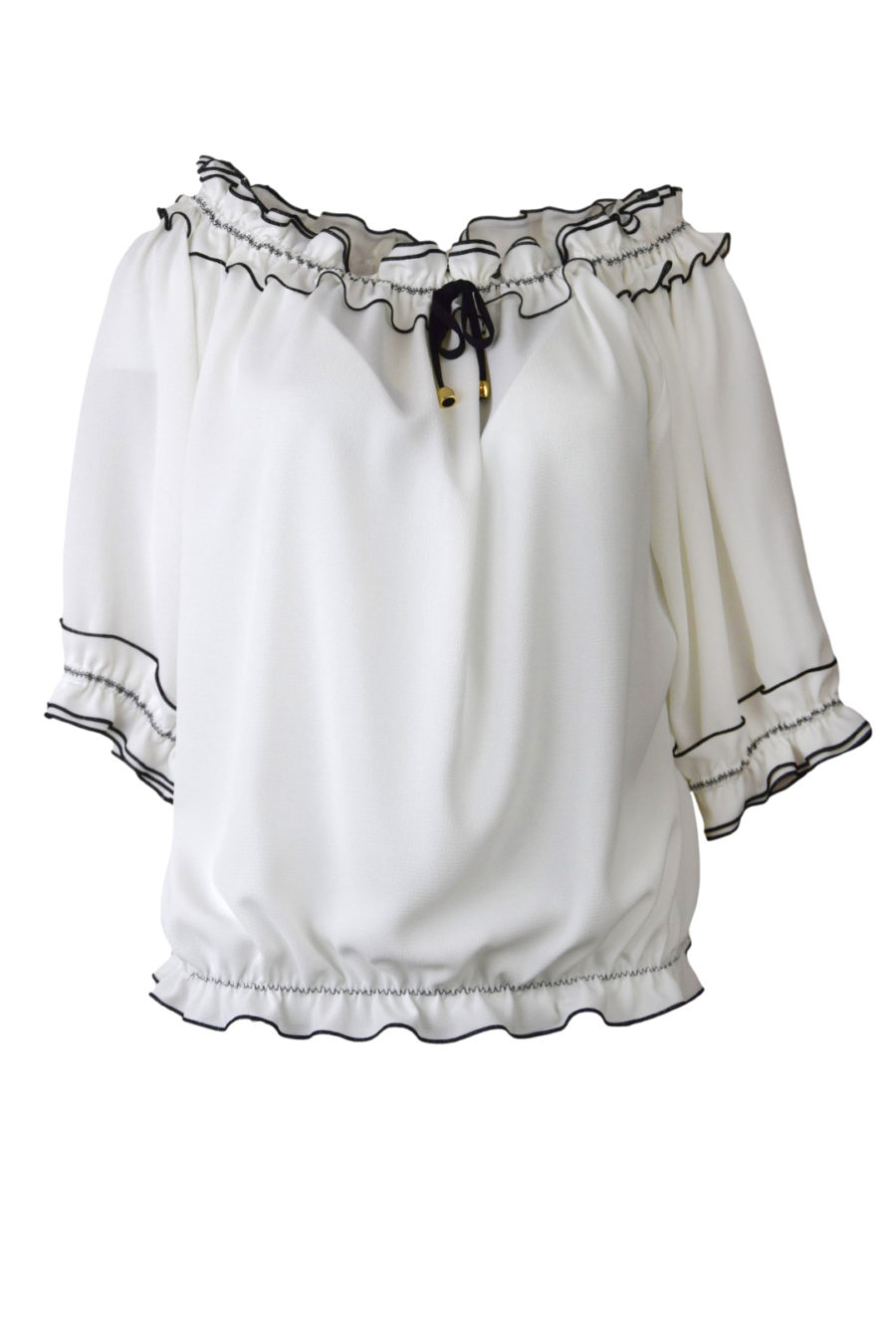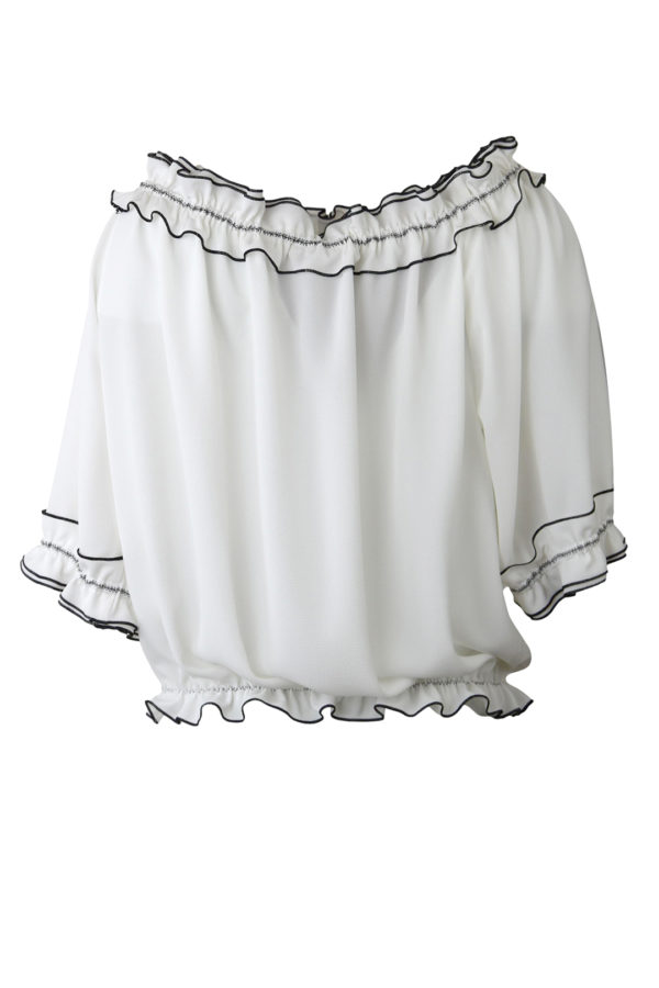 Carmenbluse mit doppelter Rüsche und Schleife