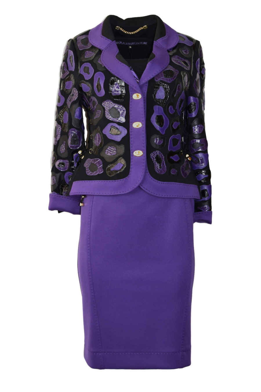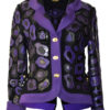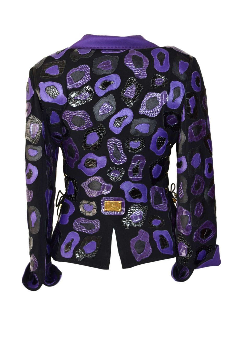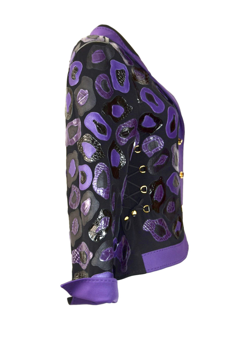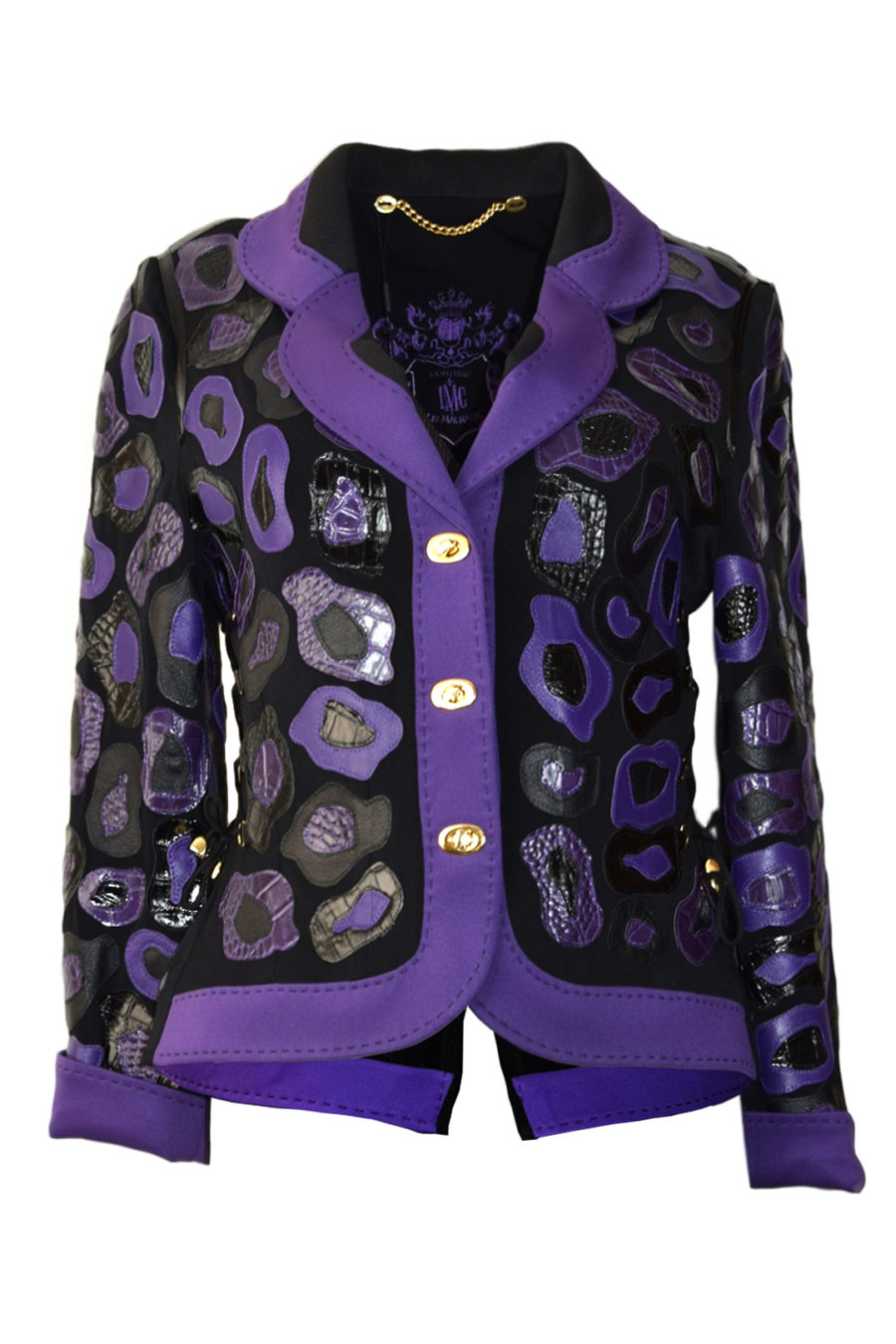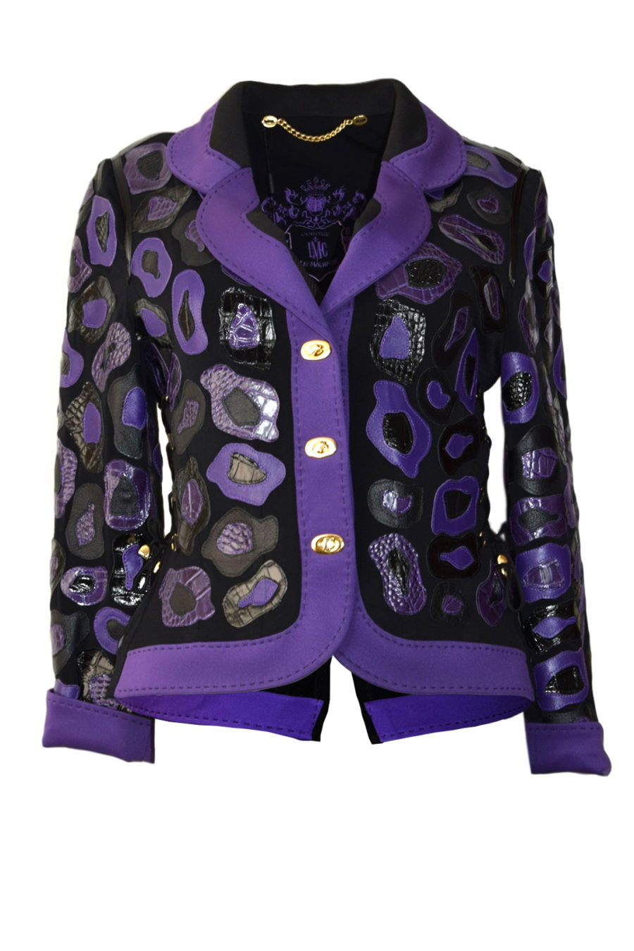 Couture-Jacke mit vierlei Leder in violett und breiter Einfassung in Doublejersey