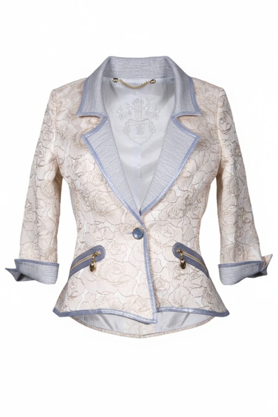 Couture-Jacke mit gestickter Passe, Brokat mit grau-blauen Kontrasten