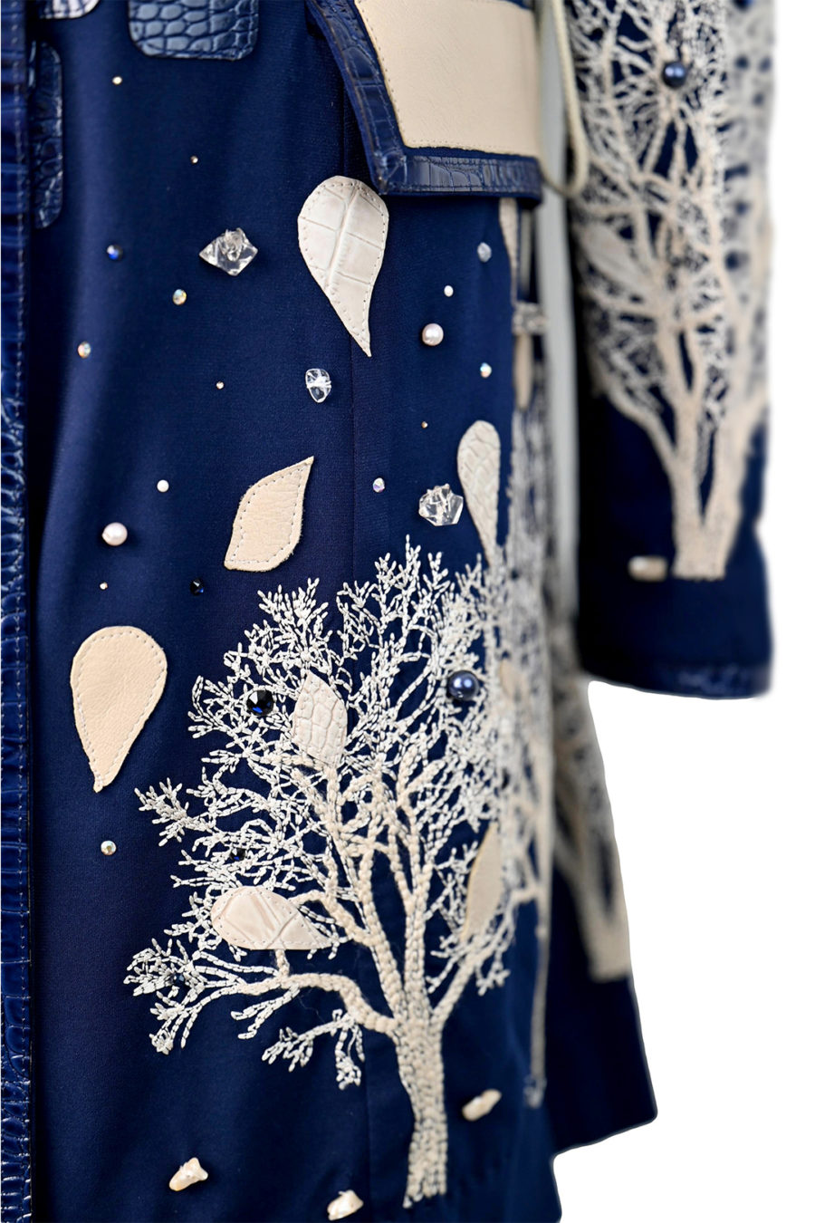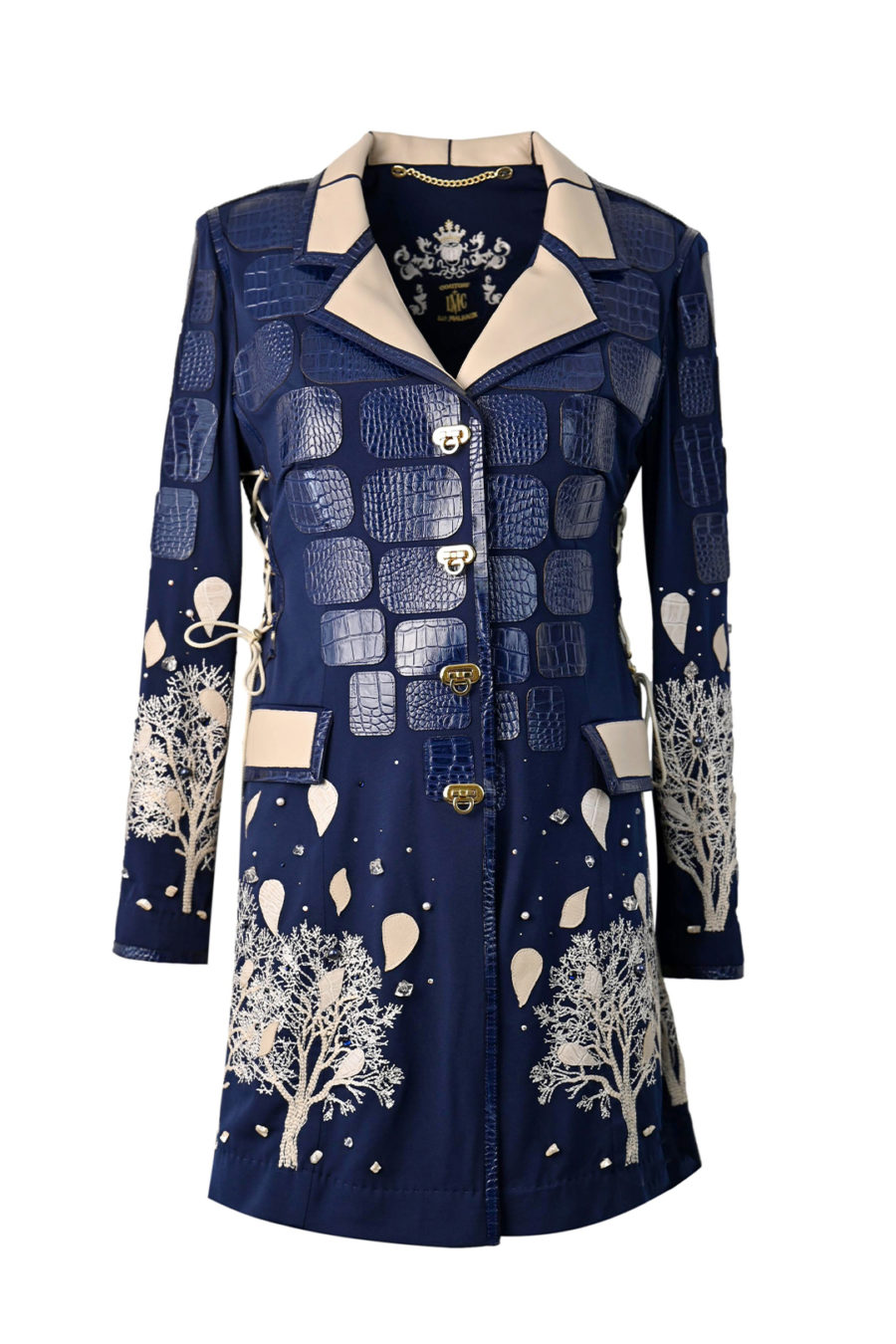 Couture Longblazer: Ein Meisterwerk der Eleganz mit „forest-embroidery“ in vier kunstvollen Motiven. Handappliziert mit 250 funkelnden Kristallen und edlen Natursteinen, verziert durch stilvolle Patches und filigrane Mini-Blätter in edler Kroko-Optik. Ein zeitloser Blickfang für besondere Anlässe.