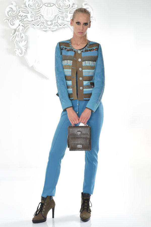 Handgewebte Jacke mit Bordüre und Taschen, Ärmel appliziert mit Leder-Patches