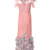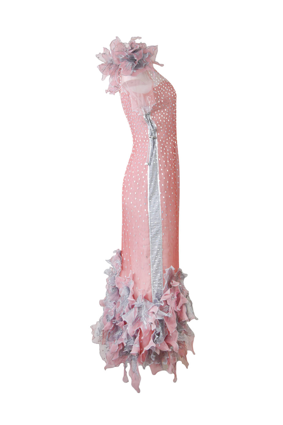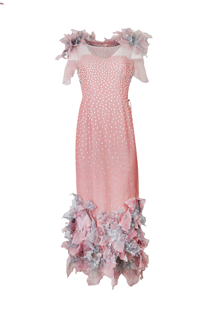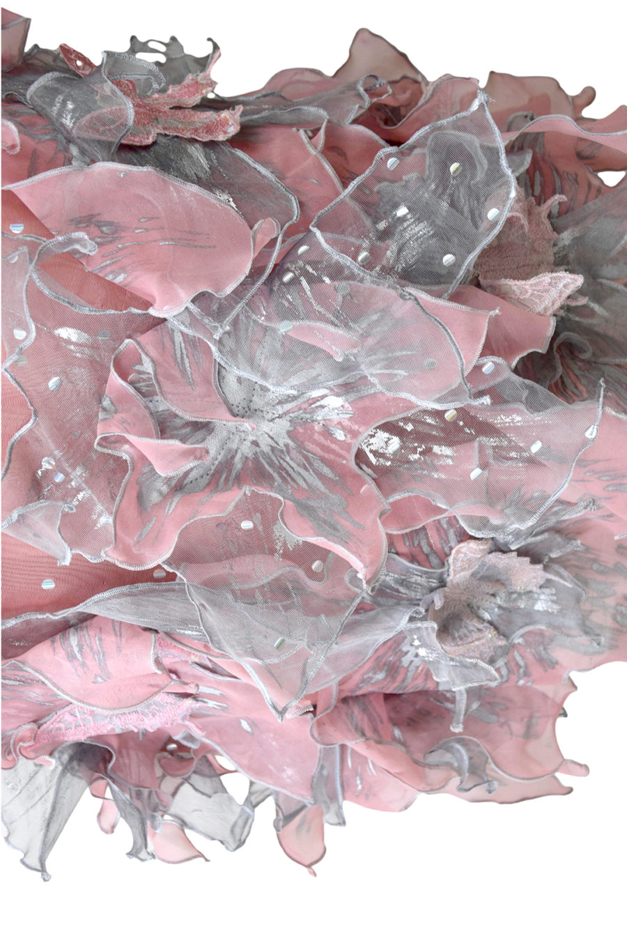 Haute Couture – Abendkleid mit handbemalten Organza – Blüten am Saum und Schulterbereich und Swarovski Perlen