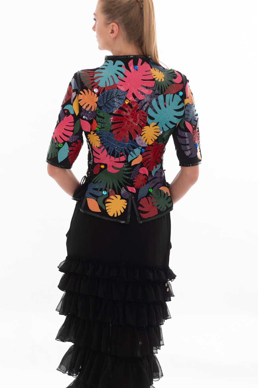 Haute Couture-Jacke appliziert mit 150 Blättern aus Krokogeprägten Leder und 40 handangenähten Kristallen, Multisize