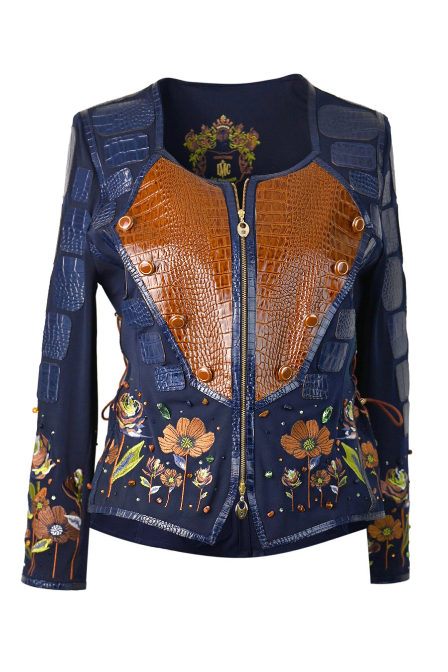 Haute Couture Jacke mit “Autumn Meadow”-embroidery, Stich: 255.000,160 handapplizierten Naturedelsteinen und Kristallen, Ledereinsatz und Patches in Kroko-Optik, Multisize
