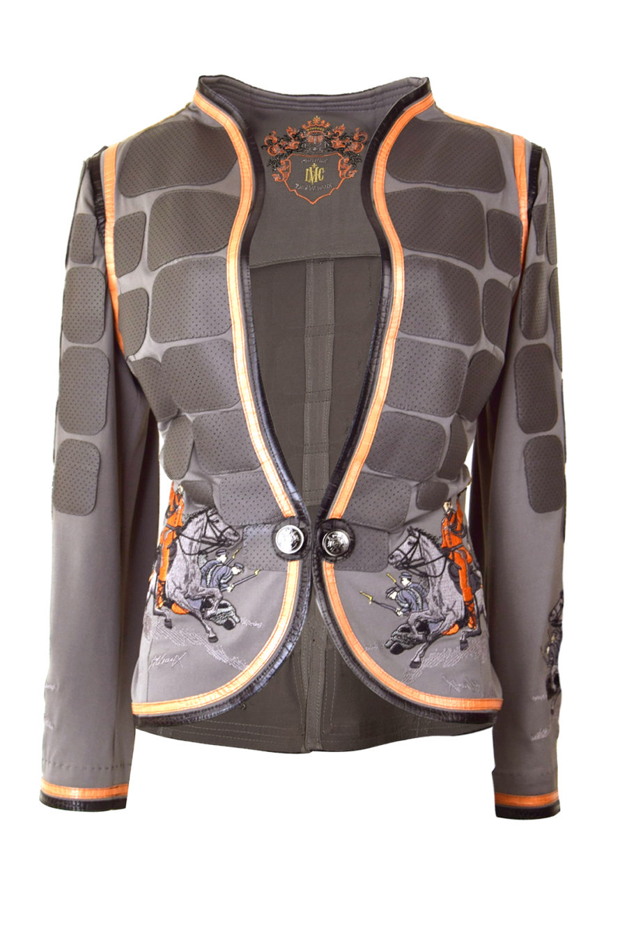 Die Couturejacke ist aus pflegeleichtem Jersey, mit Krokopatches appliziert und mit einem von Liz Malraux entwickelten Stickmotiv 12-farbig bestickt.
