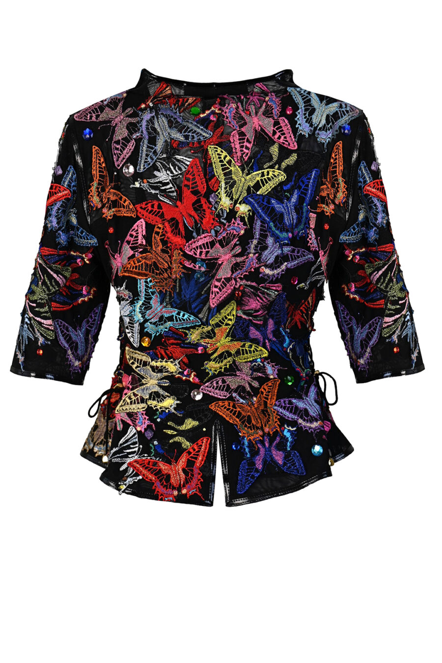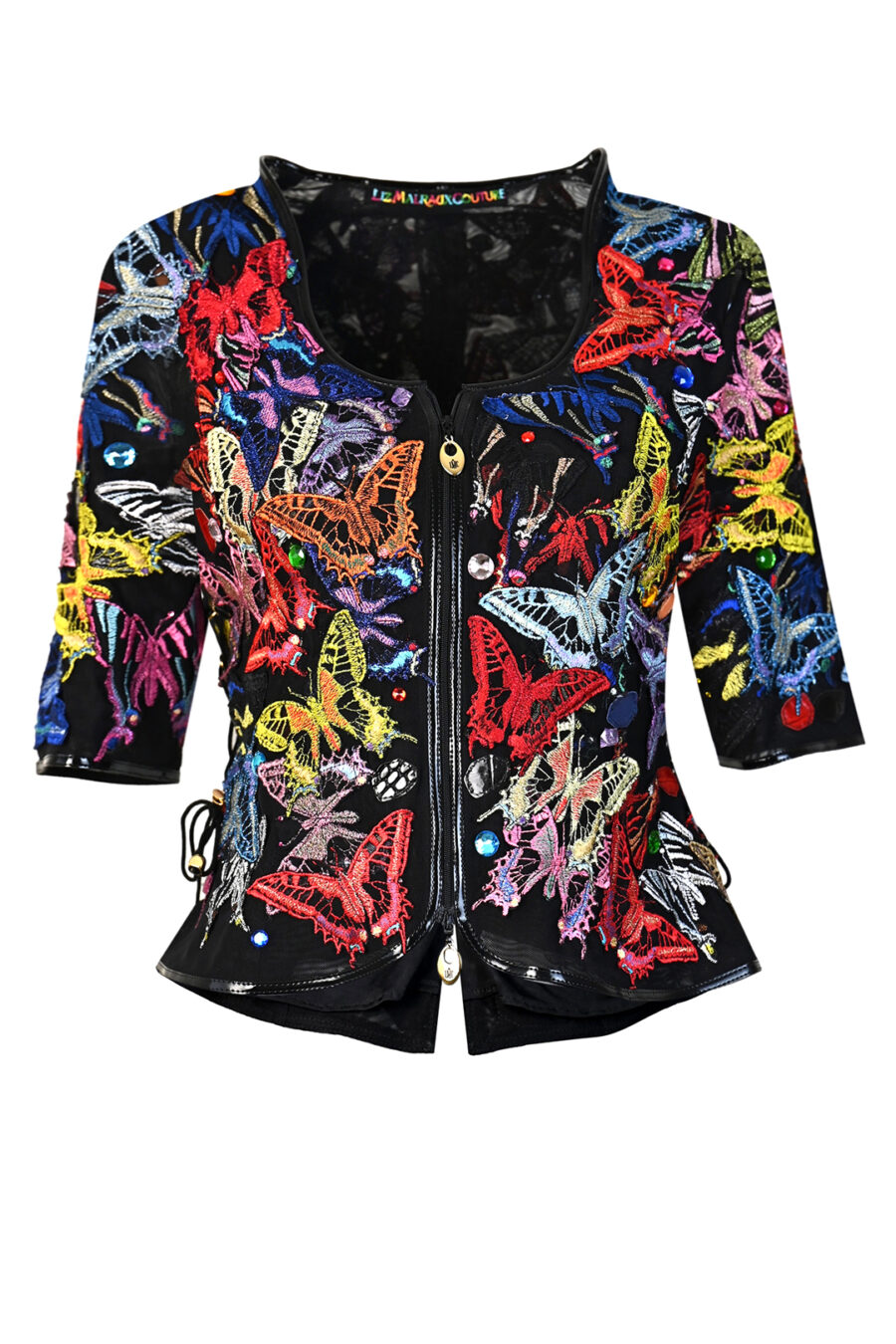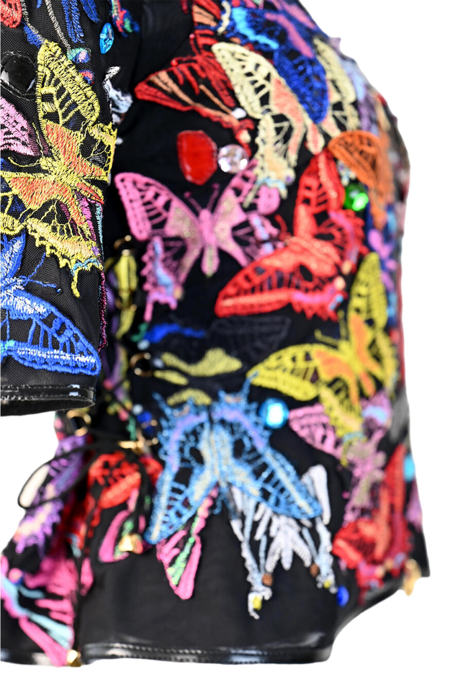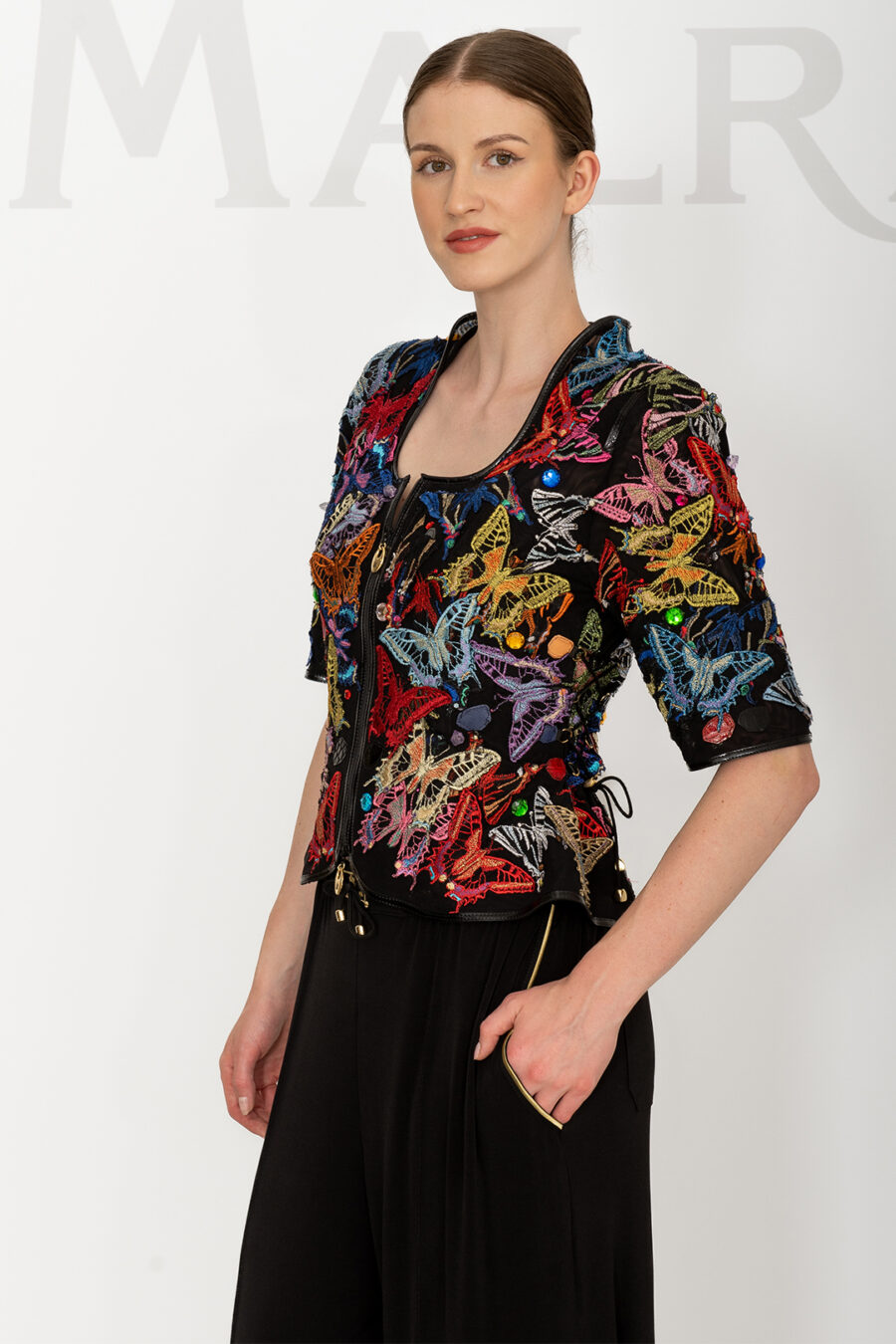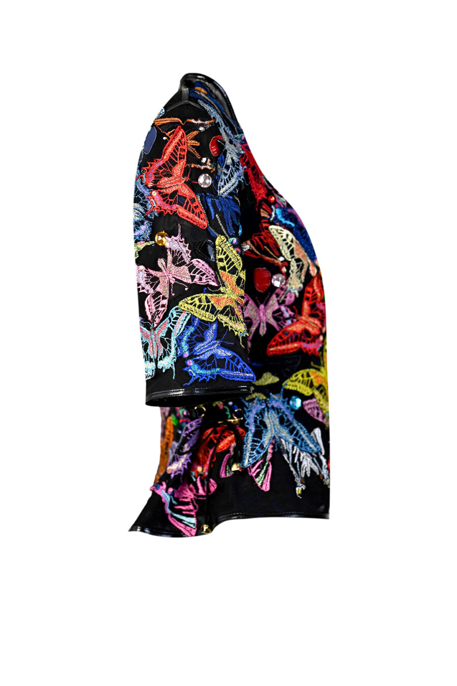 Jacke mit gestickten und handapplizierten Schmetterlingen und 50 handapplizierten Kristallen. Multisize, Kurzarm