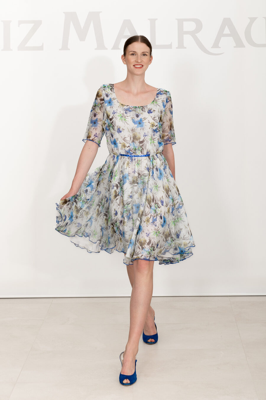 Kleid aus reiner Seide mit glockig geschnittenem Rockteil, verziert mit Lackstreifen, Kurzarm Menge
