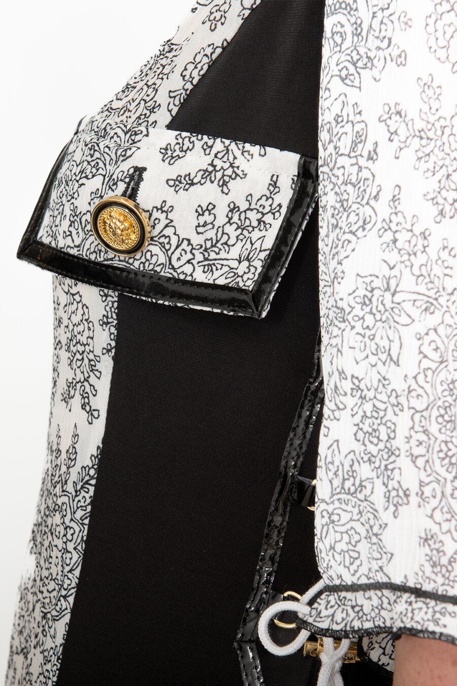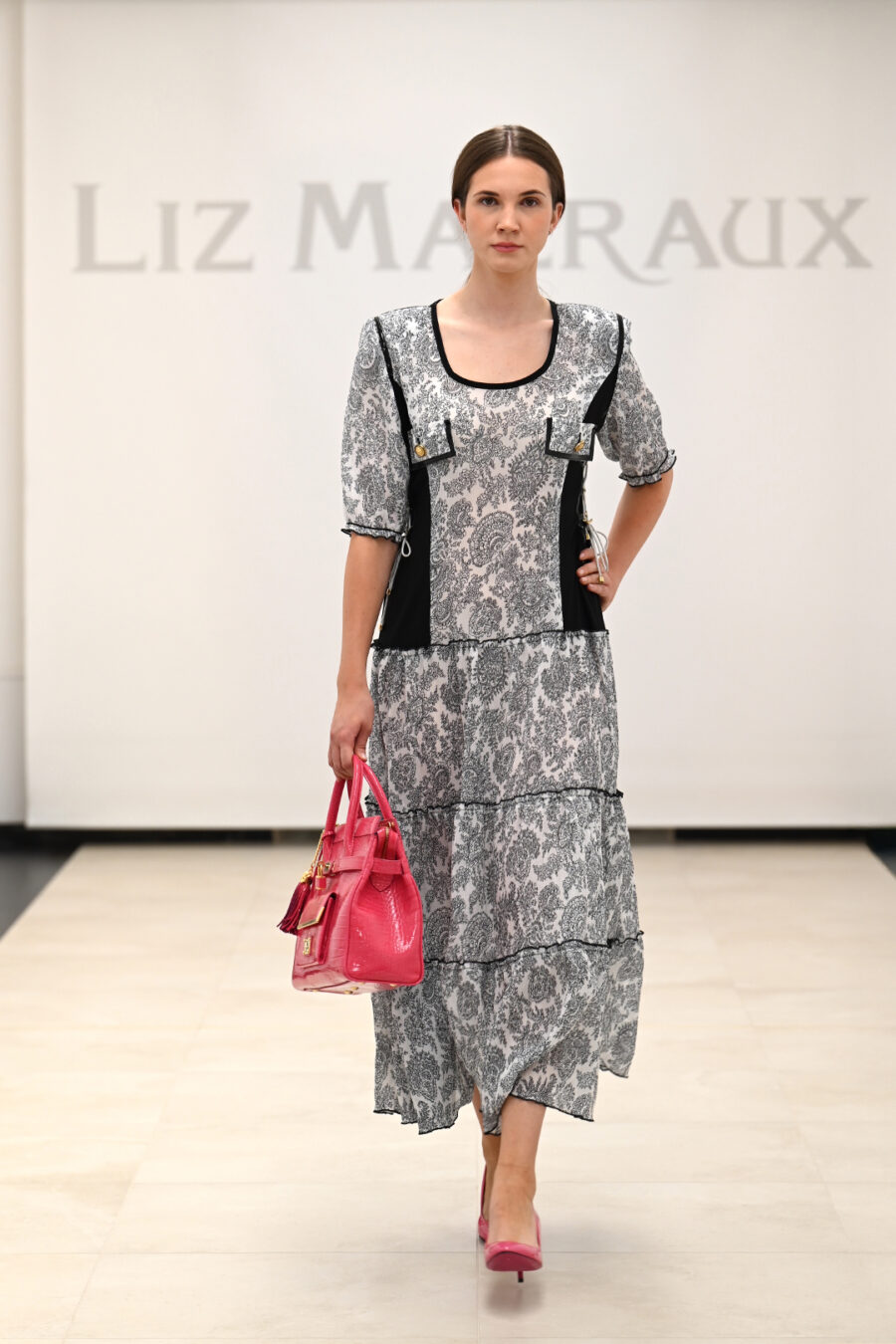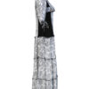 Kleid aus schwarz- weißem Crash-Stoff mit schwarzen Kontrasten, Volants und Pattentaschen Menge