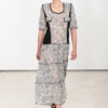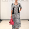 Kleid aus schwarz- weißem Crash-Stoff mit schwarzen Kontrasten, Volants und Pattentaschen