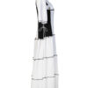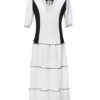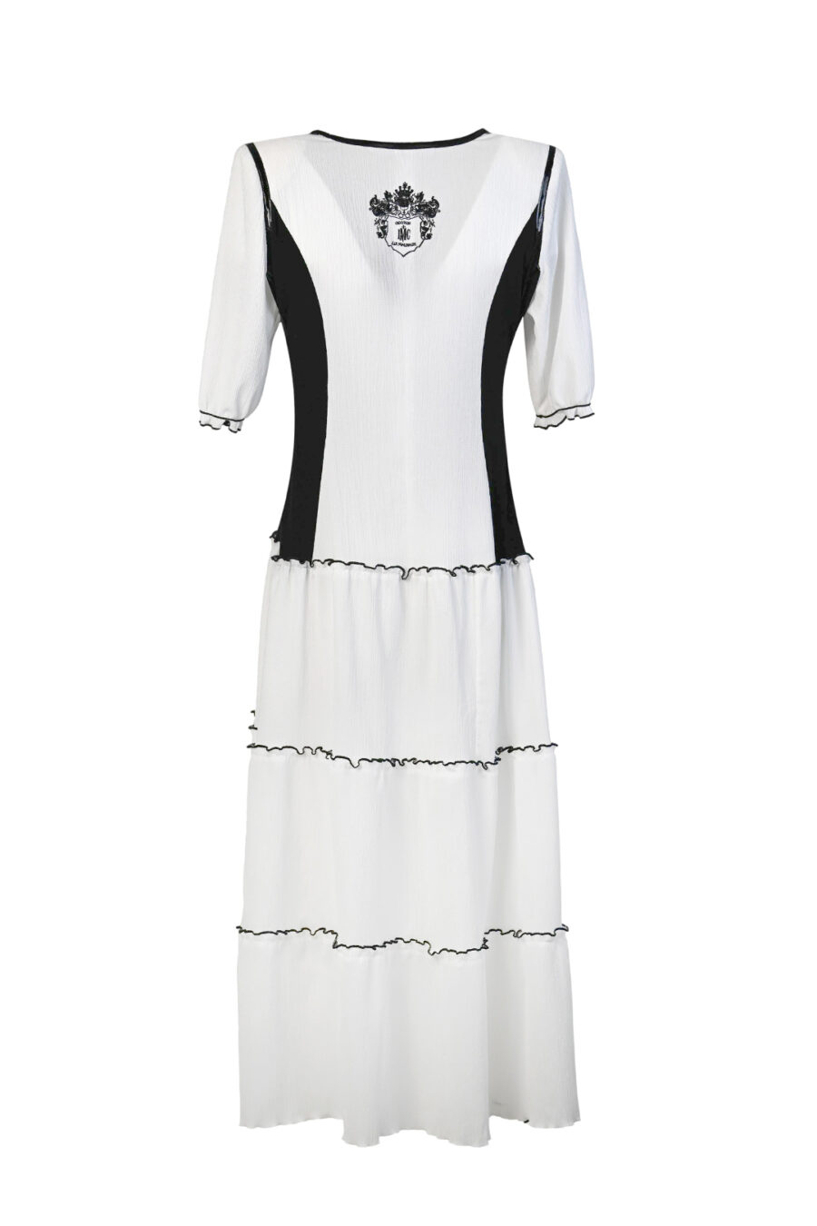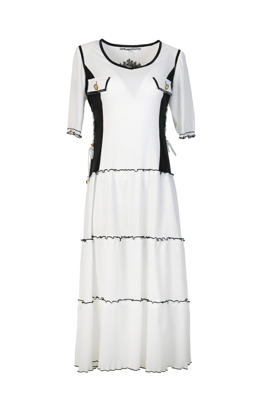 Kleid aus weißem Crash-Stoff mit schwarzen Kontrasten, Volants und Pattentaschen