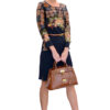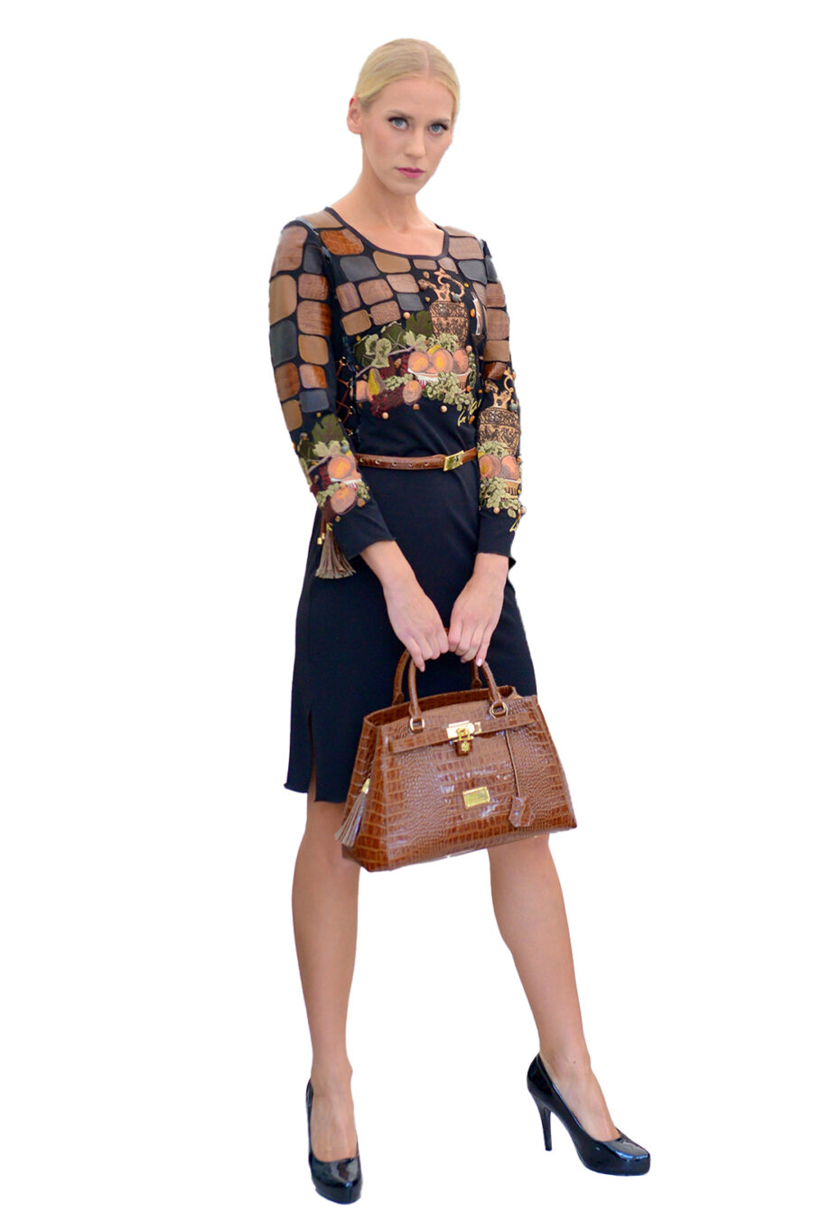 Die aufwendige Stickerei wurde in 12 herbstlichen Farbtönen auf hochwertigem Singlejersey gefertigt. Das Kleid ist zusätzlich mit Lederpatches versehen, die die Farbpalette perfekt ergänzen. Mit 7/8-Ärmeln und praktischen seitlichen Eingriffstaschen vereint es Eleganz und Funktionalität.