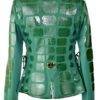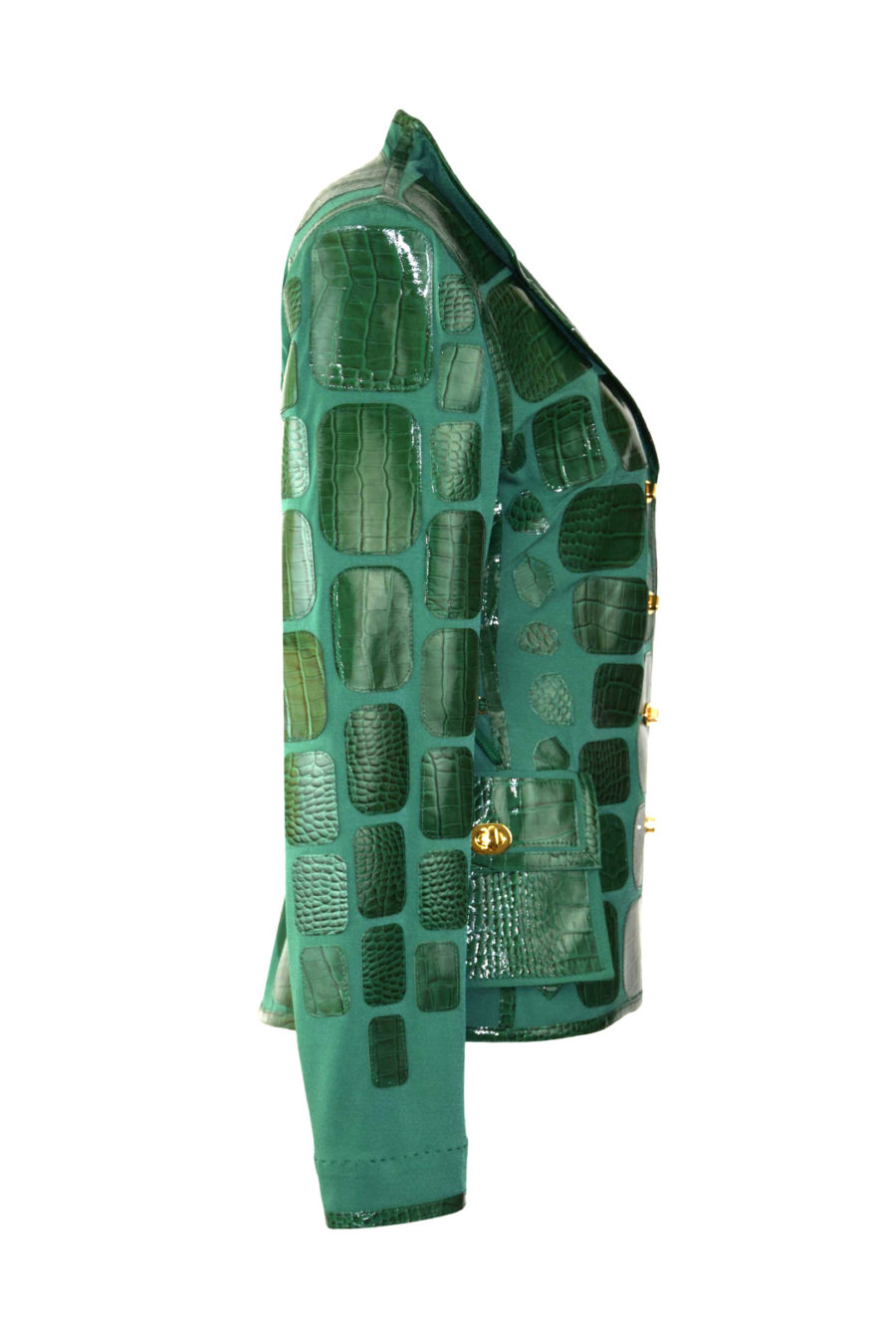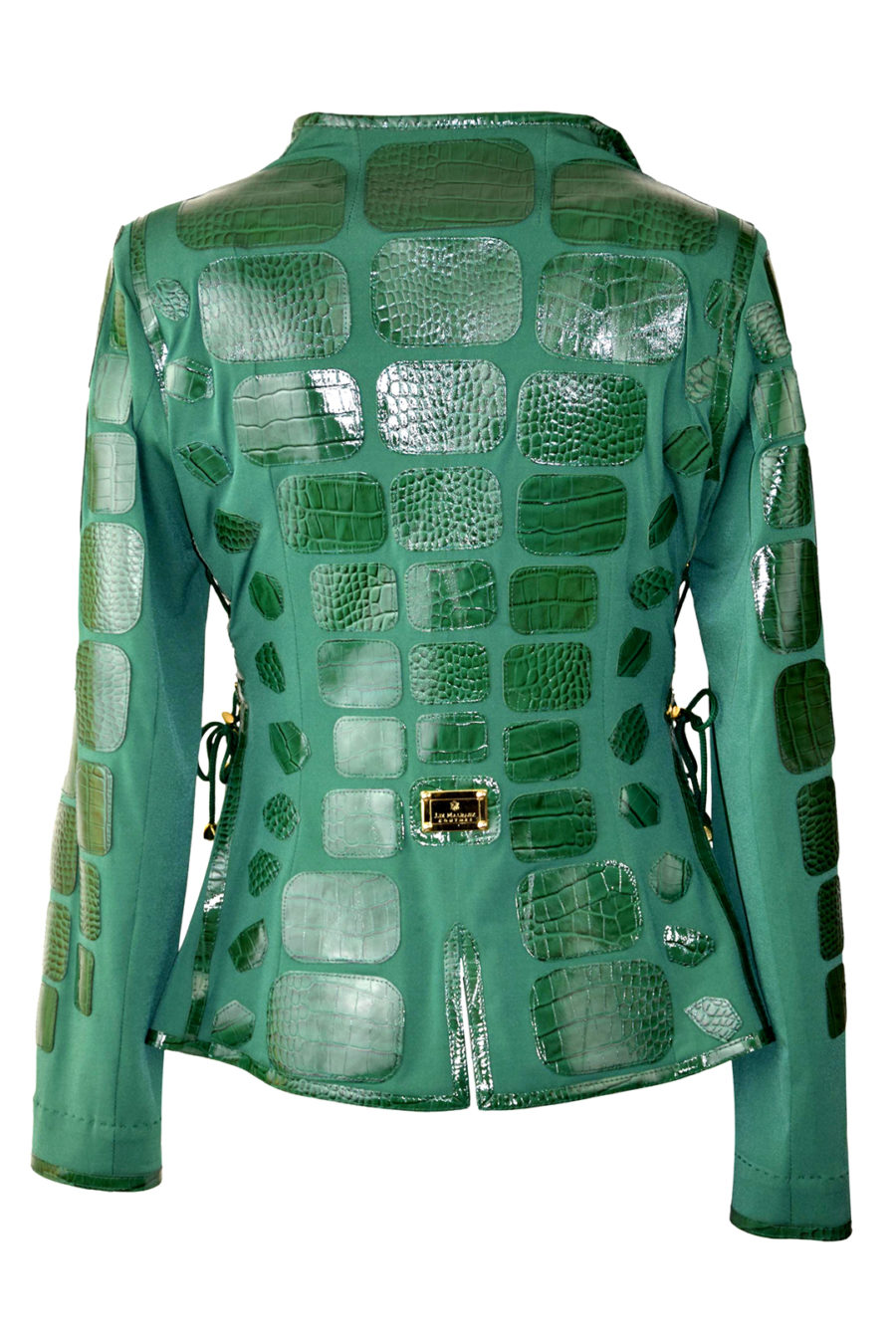 Diese Couture Jacke wird aus einem pflegeleichten Jersey gefertigt und mit Krokopatches appliziert. Durch das individuelle Ansetzen der Patches entsteht eine perfekte Silhouette. Die seitlich angesetzte Multisize-Schnürung ermöglicht es, die Passform und die Taillierung individuell anzupassen.