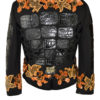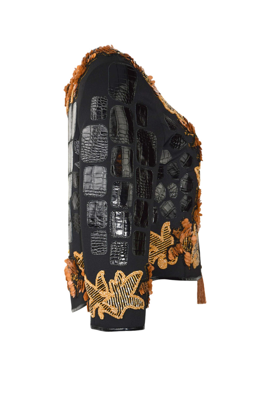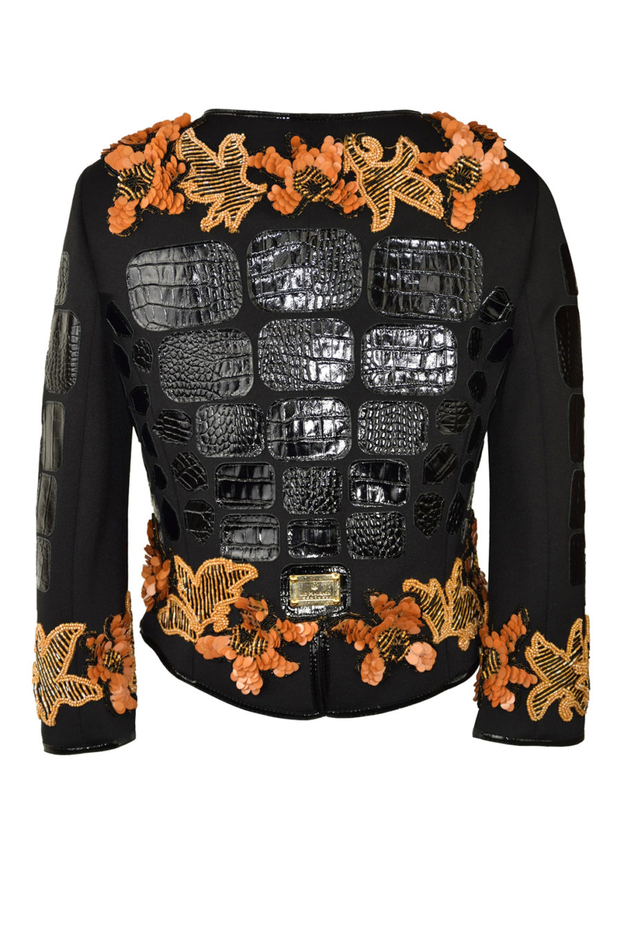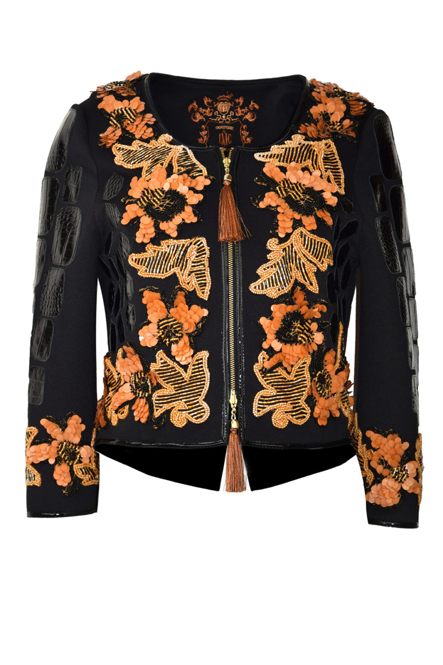 Jacke mit Maxi-Pailletenspitze, 3/4 Arm und Reißverschluss mit Madeiraquaste, Lederpatches in Kroko-Optik
